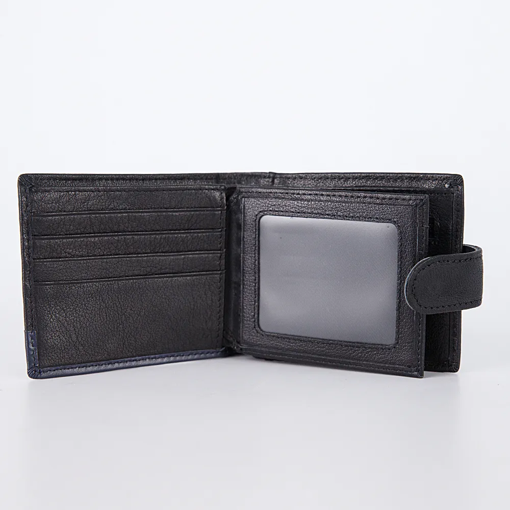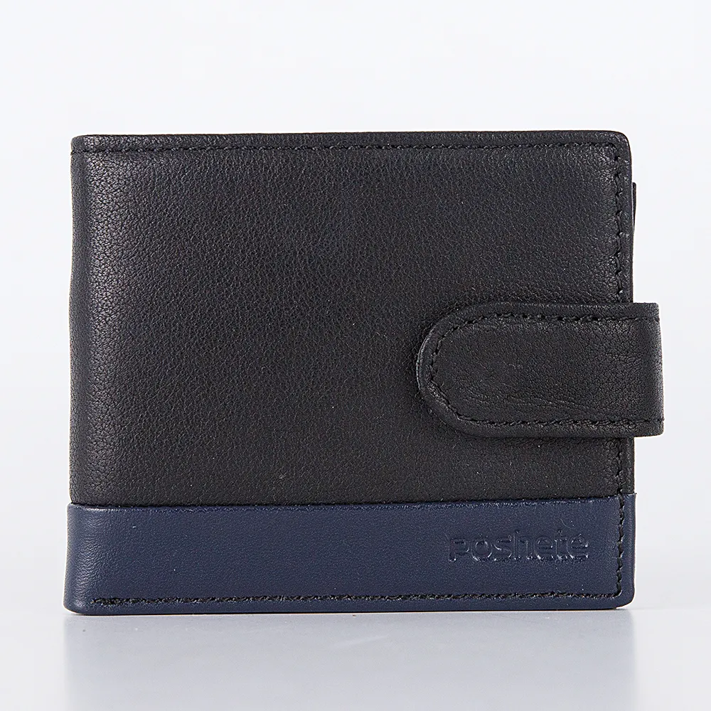 Практичный мужской кошелек из натуральной кожи от бренда Poshete. Модель черного цвета украшена с лицевой стороны кожаной нашивкой более светлого оттенка. Кошелек закрывается на кнопку, внутри отделение для купюр, карманы для пластиковых карт и прорезной карман для мелких монет. Удобно хранить как в сумке, так и в кармане одежды.
