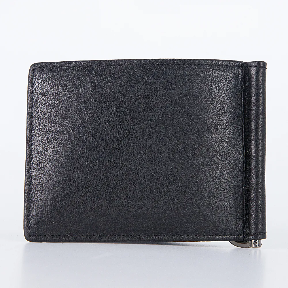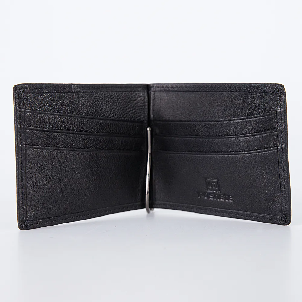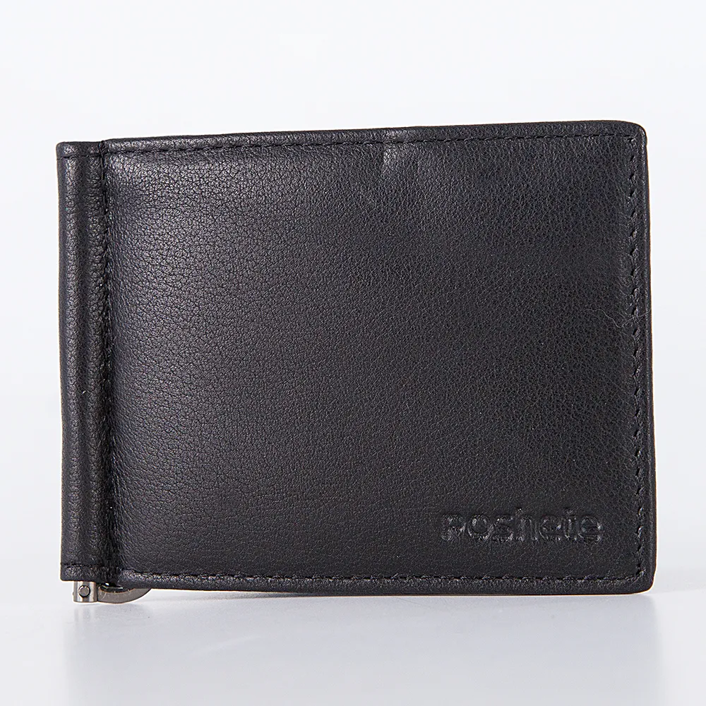 Мужской зажим для купюр из натуральной кожи в черном цвете от бренда Poshete. С лицевой стороны украшен аккуратной гравировкой бренда. Аксессуар компактен и не занимает много места. Внутри кроме зажима есть карманы для банковских карт. Аксессуар может стать хорошим подарком по любому случаю.