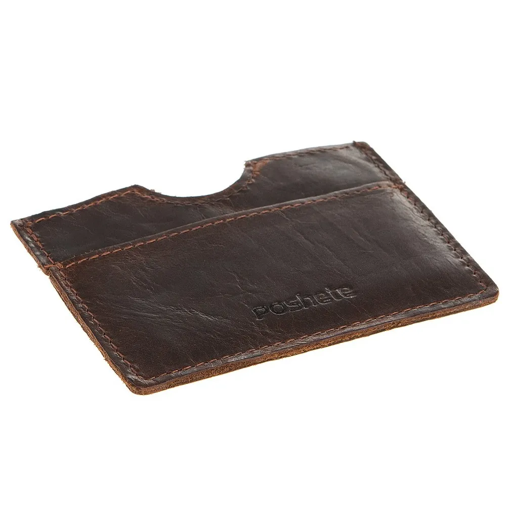 Компактная визитница Poshete выполнена из натуральной кожи в тёмно-коричневом цвете, с оборотной стороны замшевая. Имеет три кармана для пластиковых карт, без застёжек.