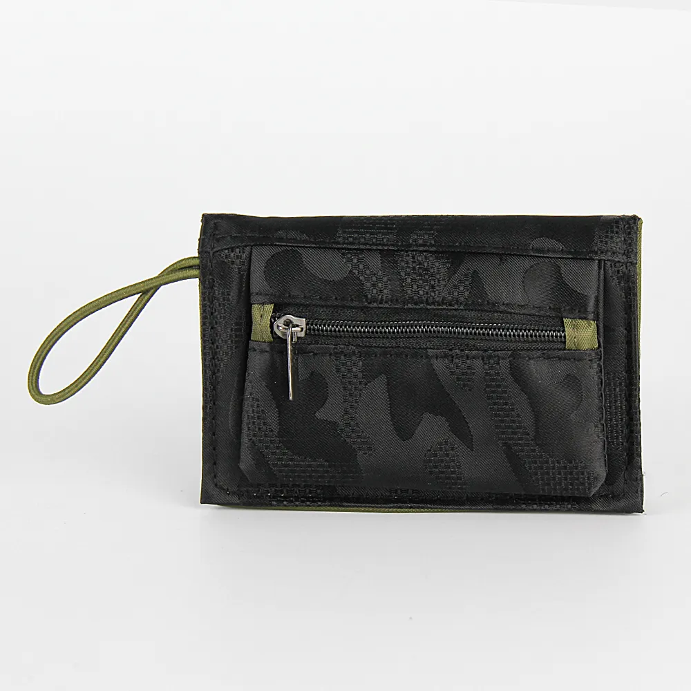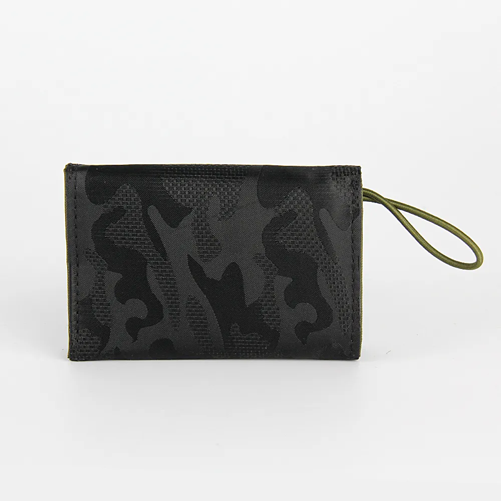 Кошелек от торговой марки Ecotope из текстильного материала черного цвета с принтом «камуфляж». Модель имеет два сложения; фиксируется липучкой. Внутри: отделение для купюр, карман на молнии, карманы для карт, карман-окошко. На задней стороне – карман на молнии. Имеется петля-резинка для ношения и крепления.