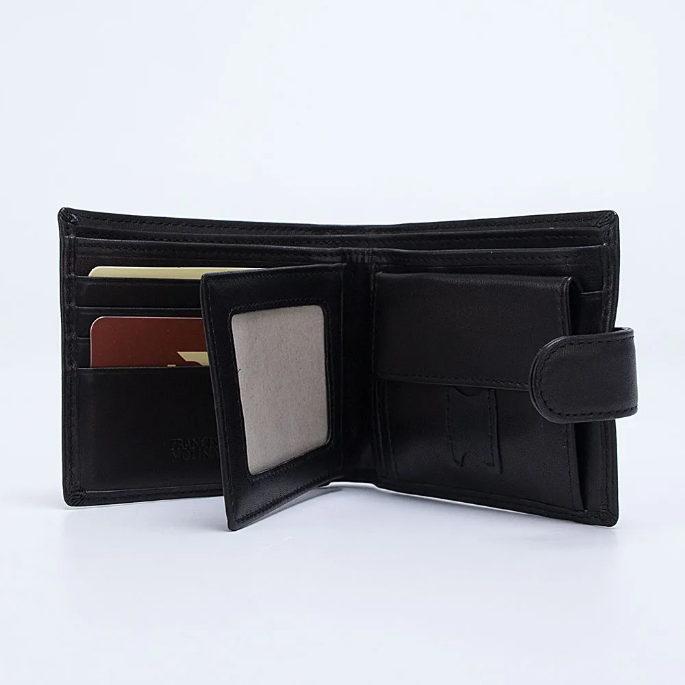 Классический мужской кошелек от бренда Francesco Molinary выполнен из натуральной мягкой кожи черного цвета с тисненым логотипом бренда. Внутри два отделения для купюр, несколько прорезей для пластиковых карт, а также карман для монет на кнопке. Аксессуар с застежкой на ремешок на кнопке.
