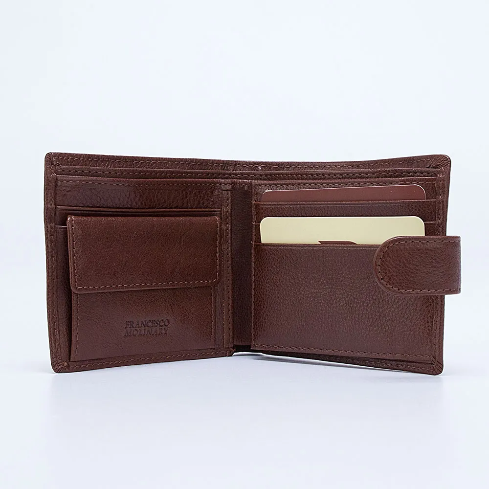 Кошелек из натуральной мягкой матовой кожи от бренда Francesco Molinary для мужчин. Модель с двумя отделениями для купюр, несколькими прорезями для пластиковых карт, а также карман для монет на кнопке. Модель с застежкой на ремешок на кнопке..
