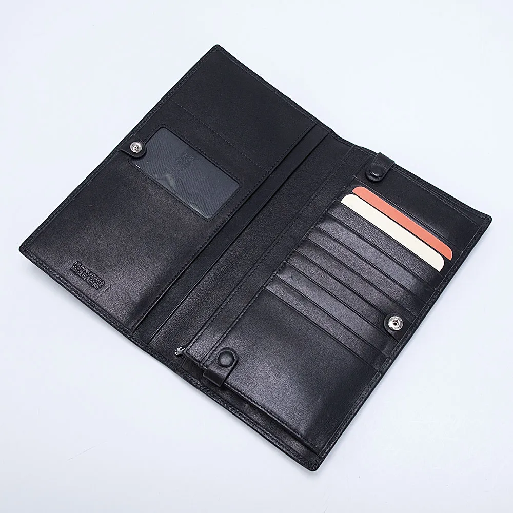 Стильный мужской бумажник от бренда Francesco Molinary выполнен из натуральной мягкой кожи с естественной фактурой. Внутри два отделения для купюр и множество прорезей для пластиковых карт. Аксессуар с застежкой на кнопку.