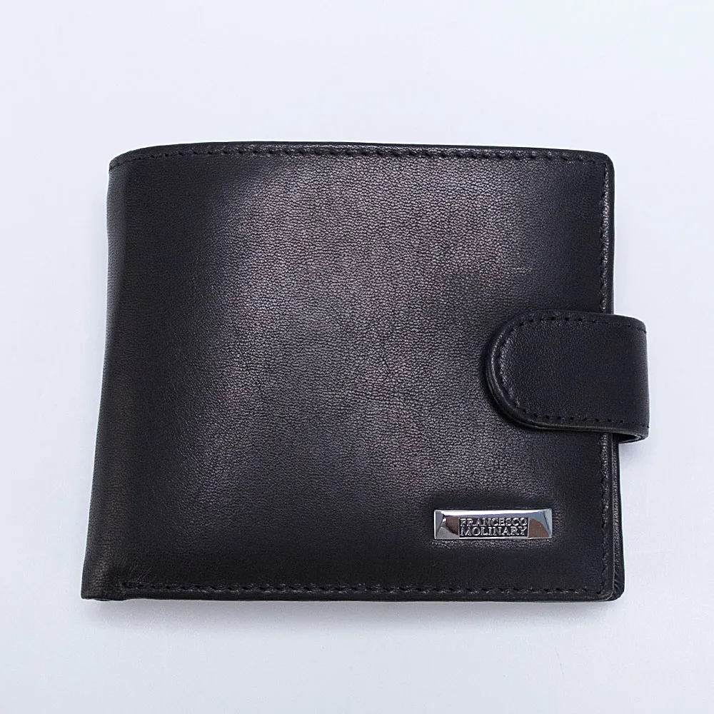 Стильный мужской кошелек Francesco Molinary из натуральной мягкой кожи с естественной фактурой и серебристой металлической фурнитурой. Внутри два отделения для купюр, карман для монет на кнопке, прорезной карман на молнии и несколько прорезей для пластиковых карт. Аксессуар с застежкой на кнопку.