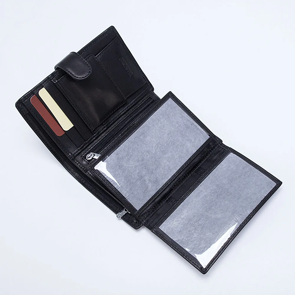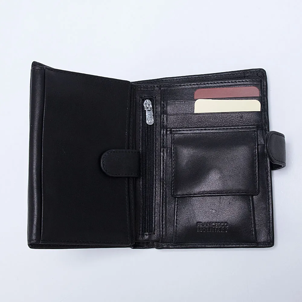 Стильный мужской кошелек Francesco Molinary из натуральной мягкой кожи с естественной фактурой и серебристой металлической фурнитурой. Внутри два отделения для купюр, карман для монет на кнопке, несколько прорезей для пластиковых карт и отделения для паспорта и автодокументов. Аксессуар с застежкой на кнопку.