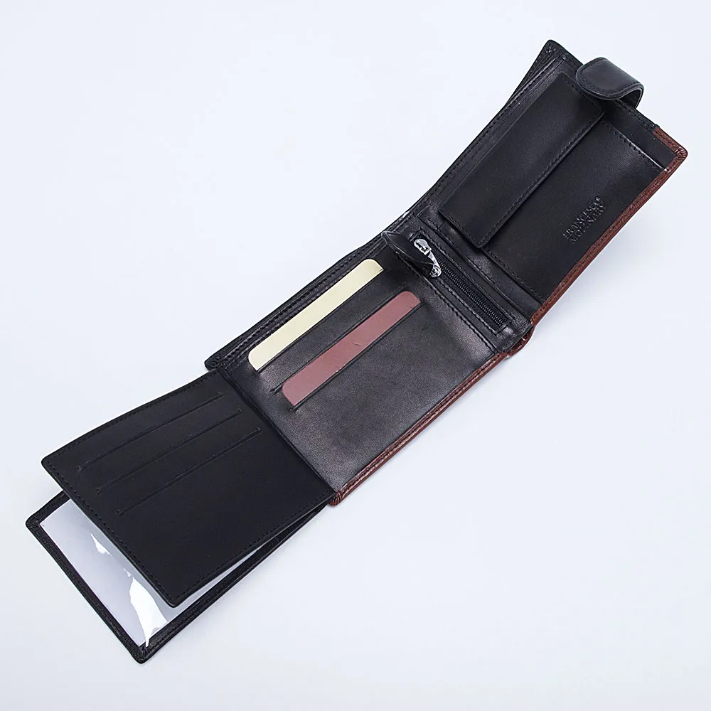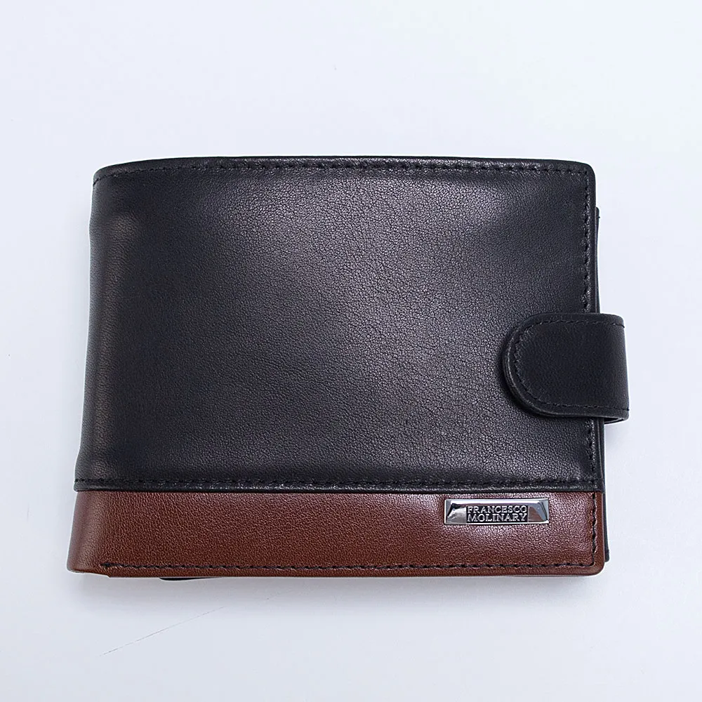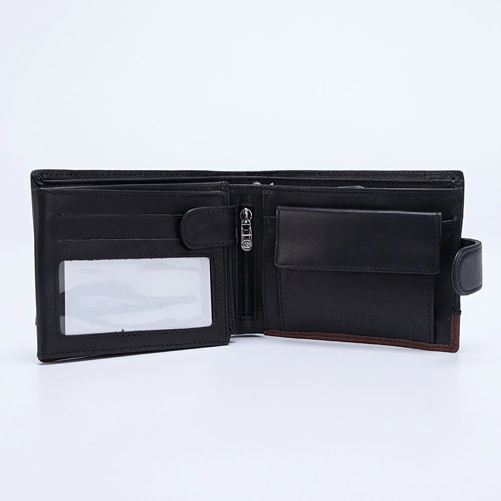 Кошелек от торговой марки Francesco Molinary изготовлен из натуральной кожи черного цвета с декоративной коричневой вставкой. Модель с одним сложением; закрывается хлястиком на кнопке, раскрывается книжкой. Внутри: отделение для купюр, откидная перегородка с фиксатором и карманами для карт, с карманом-окошком; карман на молнии посередине, отделение для монет с клапаном.