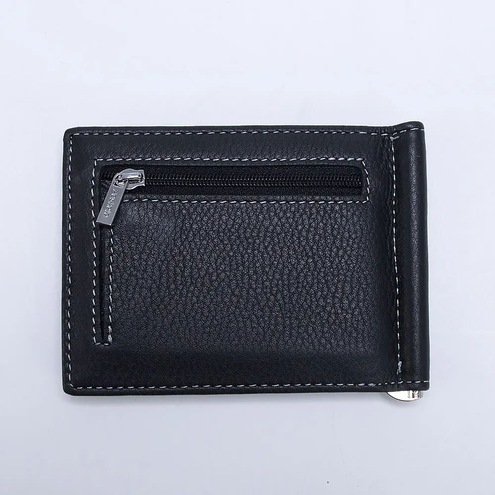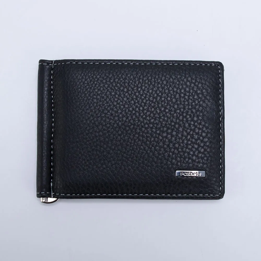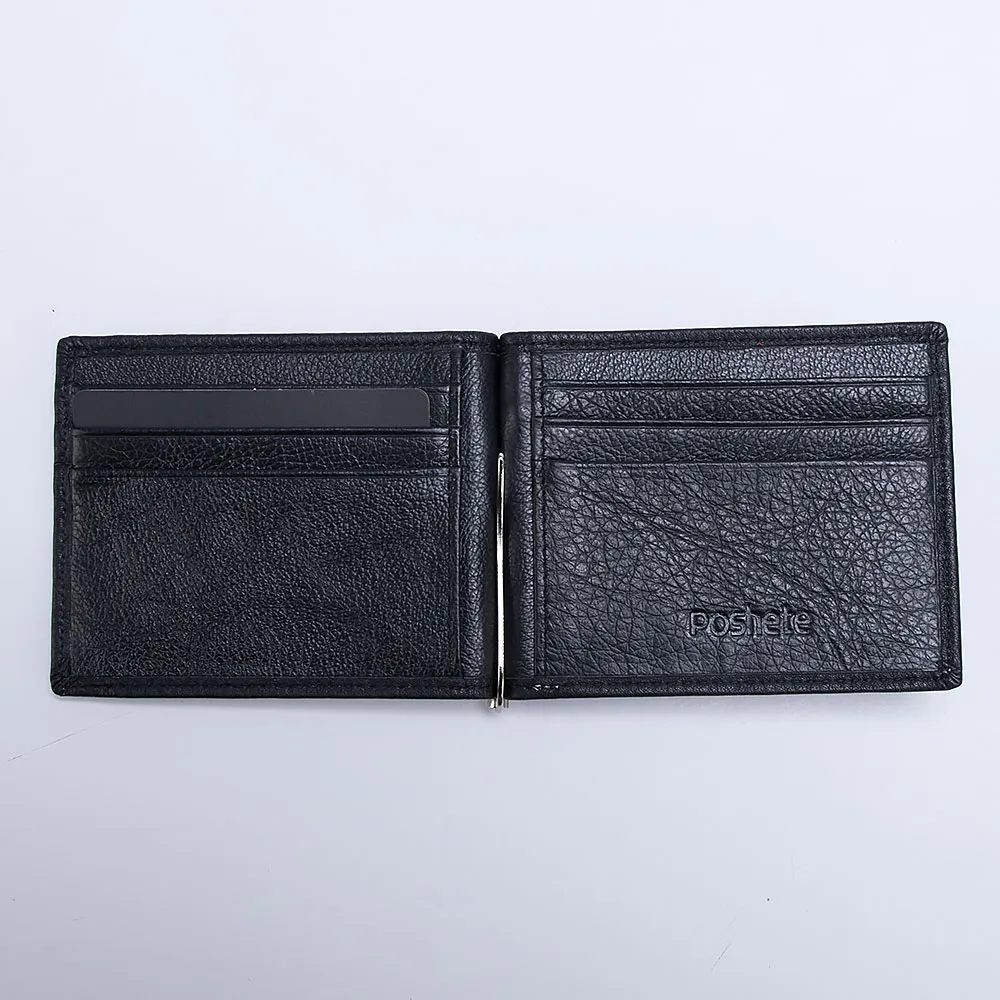 Классический зажим для денег Poshete из натуральной фактурной кожи, выполнен в чёрном цвете и украшен золотистым металлическим шильдиком с логотипом бренда. Зажим находится по центру, а слева и справа по три кармашка для карточек или визиток.