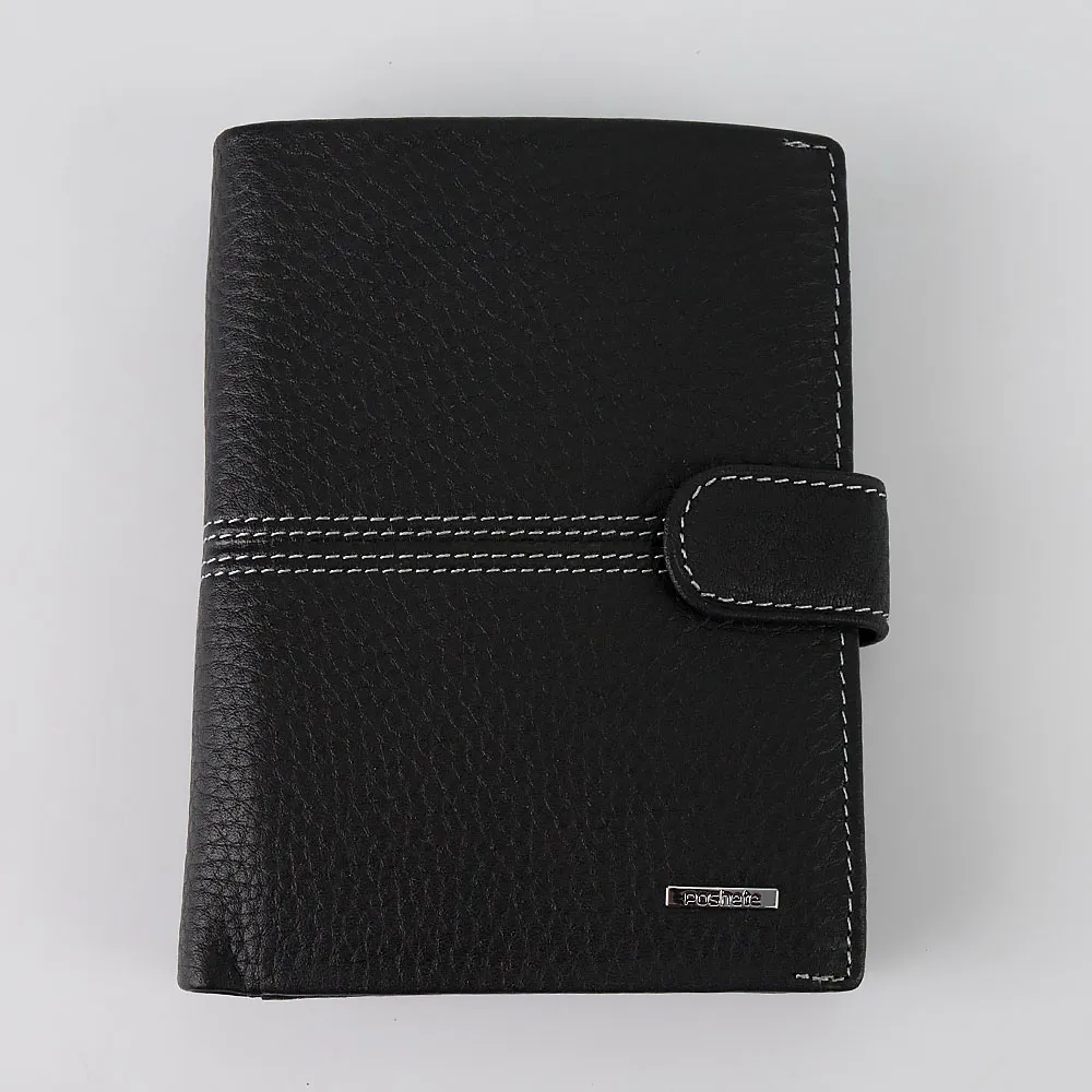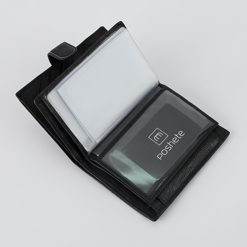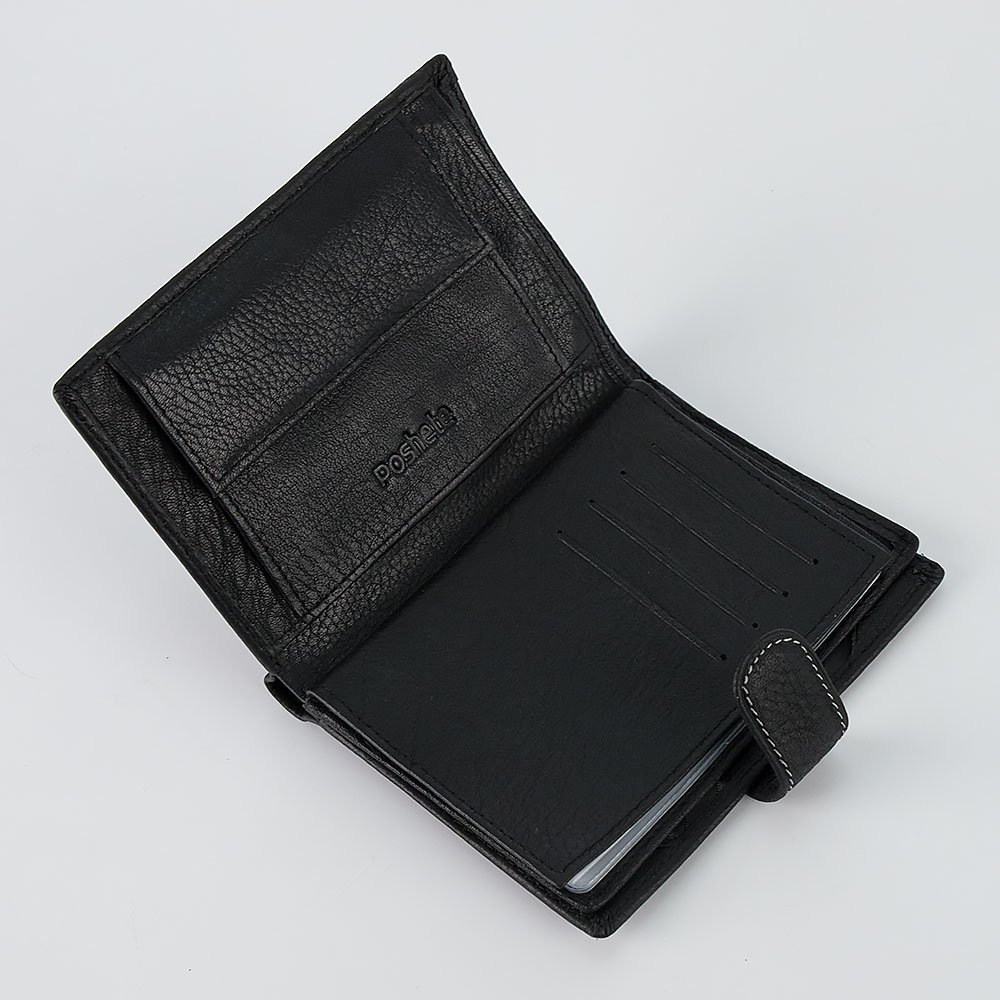 Универсальный бумажник Poshete чёрного цвета из натуральной фактурной кожи. По середине на лицевой стороне прошит белой строчкой. Внутри два отделения для купюр, кармашки для сим карт, накладной кармашек для монет на кнопке, кармашки для карточек, отделение для паспорта и пластиковые кармашки для авто документов. Бумажник книжной формы, закрывается на ремешок с кнопкой.