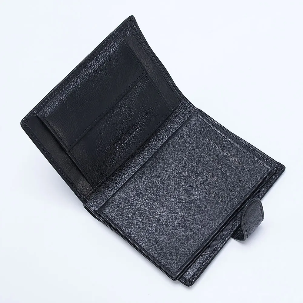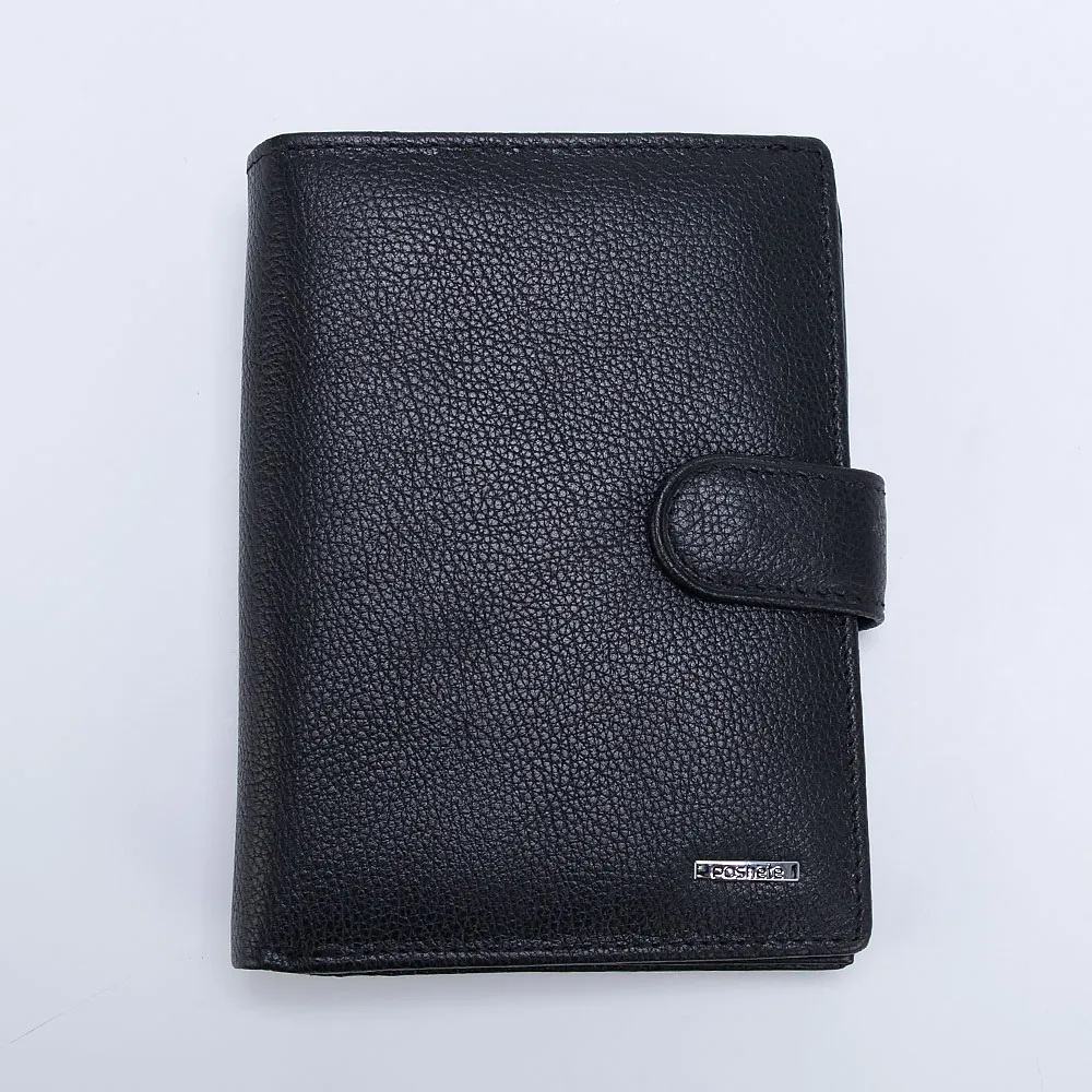 Универсальный бумажник Poshete чёрного цвета из натуральной матовой кожи. Внутри два отделения для купюр, кармашки для сим карт, накладной кармашек для монет на кнопке, кармашки для карточек, отделение для паспорта и пластиковые кармашки для авто документов. Бумажник книжной формы, закрывается на ремешок с кнопкой.