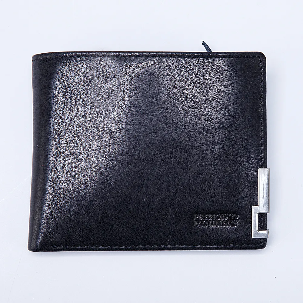 Мужской кошелёк от бренда Francesco Molinary чёрного цвета, с отличным качеством отделки, выполнен из натуральной кожи с внутренней подкладкой из текстильного материала. Квадратной формы, складывается пополам, раскрывается книжкой, без застёжки. Внутри отделение для купюр, карман на молнии, кармашки для карточек.