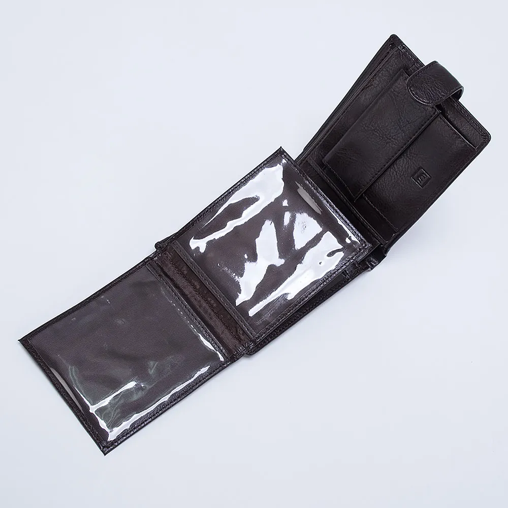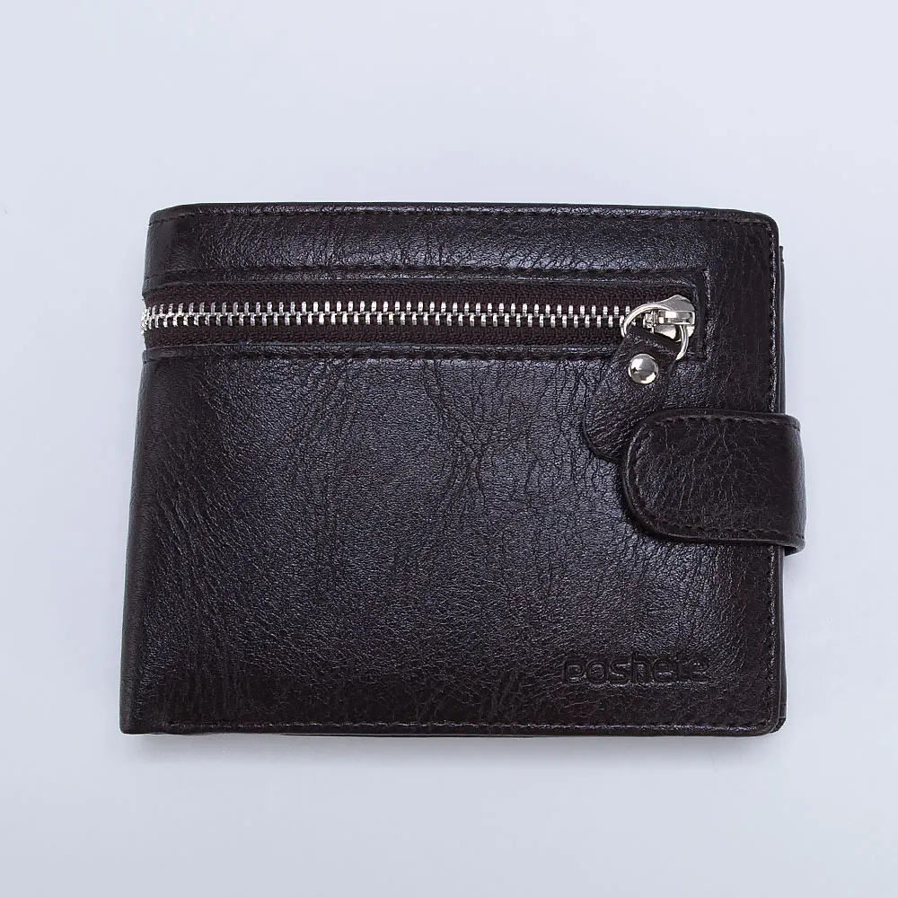 Мужской кошелёк Poshete коричневого цвета, выполнен из искусственной матовой кожи. Спереди украшен металлической молнией. Внутри два отделения для купюр, накладной кармашек для монет на кнопке, кармашки для карточек и кармашек с прозрачным окошком. Удобный в использовании, закрывается на кнопку.