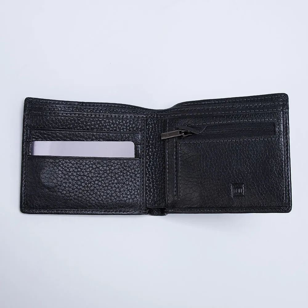 Кошелек от торговой марки Poshete из натуральной кожи черного цвета. Модель имеет одно сложение, раскрывается книжкой. Внутри – отделения для купюр, карманы для карт, карман на молнии для монет.