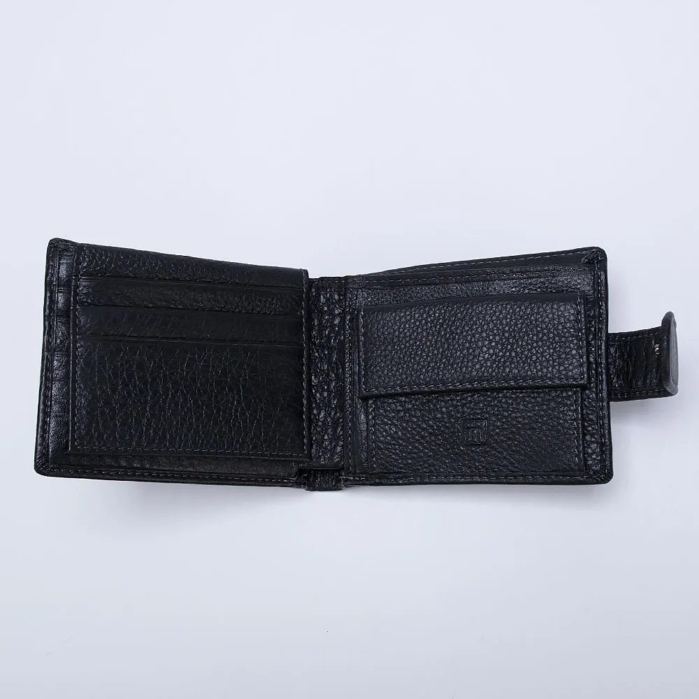 Стильный кошелек от бренда Poshete выполнен из натуральной кожи черного цвета. Модель закрывается хлястиком на кнопку. Внутри: отделение для купюр, в том числе на молнии, перегородка с карманами для карт; карман для монет закрывается клапаном. Кошелек декорирован фигурной вставкой спереди и сзади, с отстрочкой, а также тиснением с названием бренда на лицевой стороне и эмблемой бренда на монетнице.