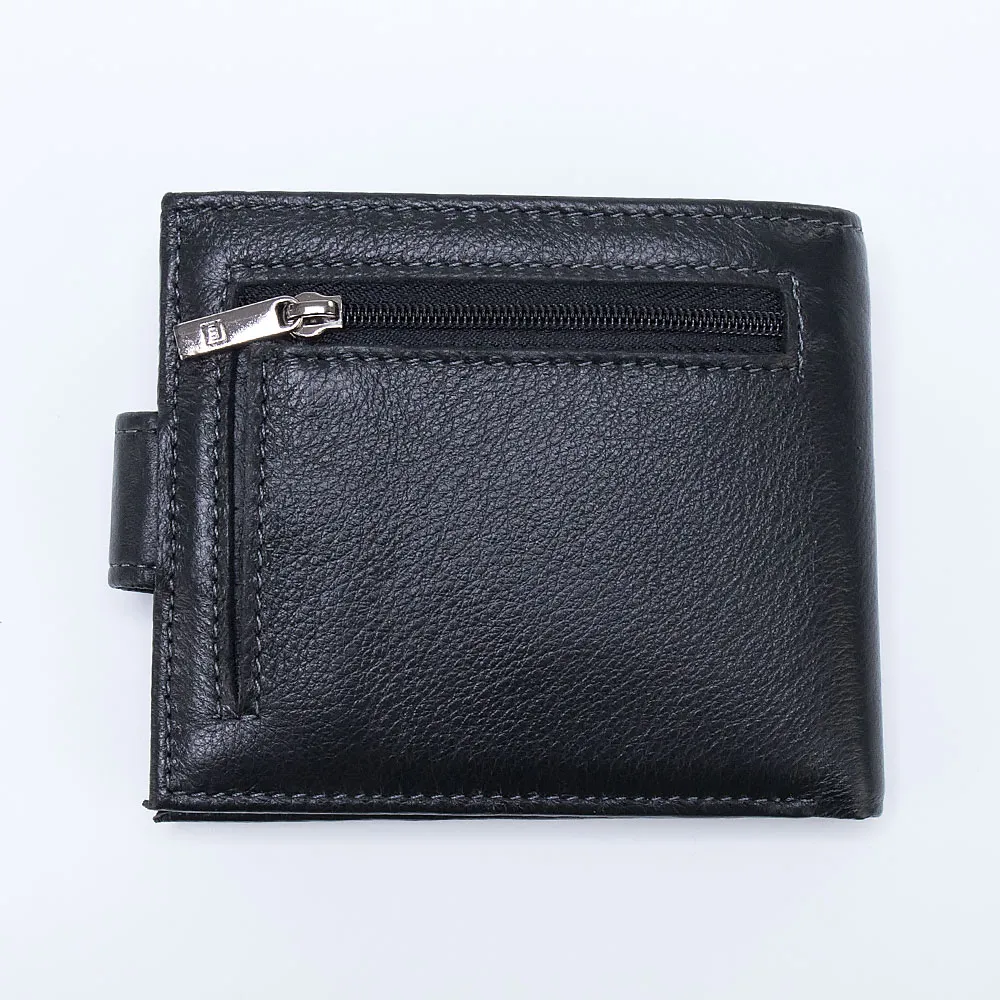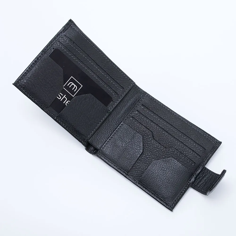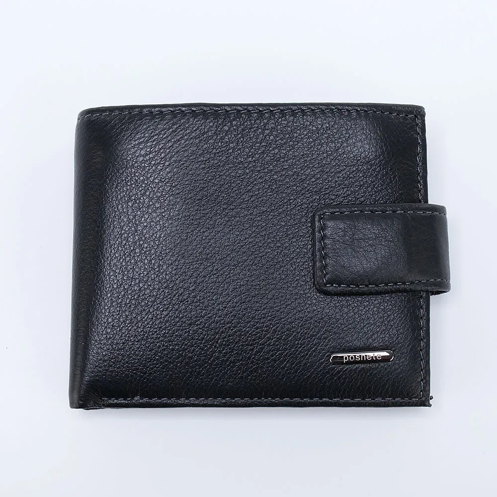 Мужской кошелек от торговой марки Poshete из натуральной кожи черного цвета. Закрывается хлястиком на магните; раскрывается книжкой. Внутри: отделение для купюр, карманы для карт. Снаружи – карман на молнии.