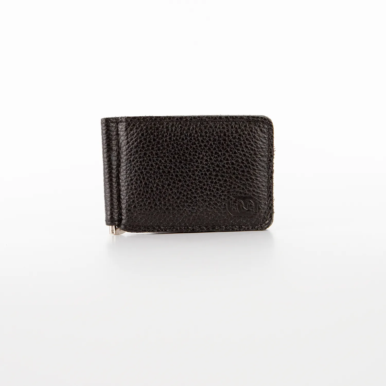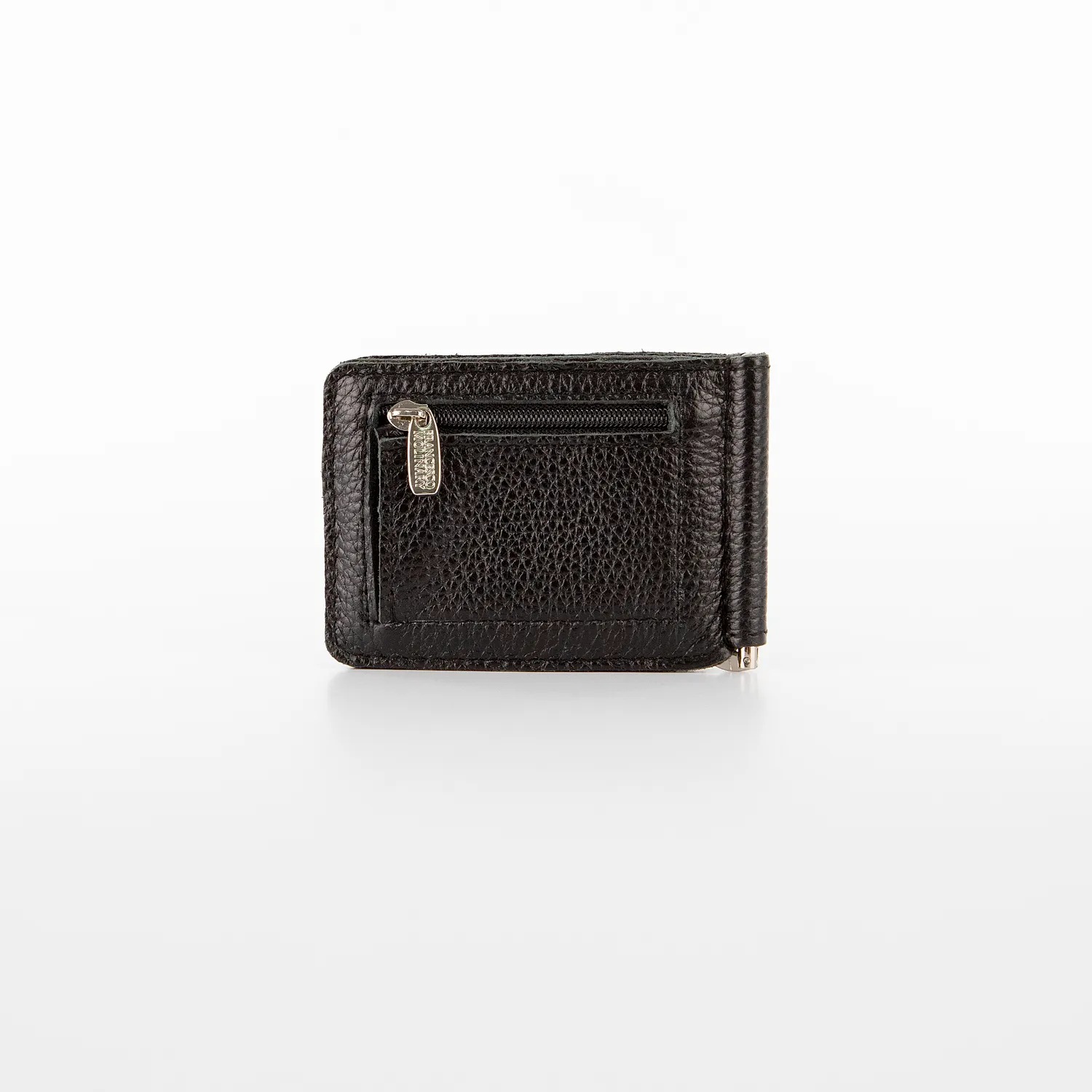 Зажим для денег от торговой марки Francesco Molinary из натуральной кожи черного цвета. Модель раскрывается книжкой. Внутри: металлическая скрепка-зажим для купюр, карманы для карт. Снаружи на задней стороне: карман для монет с клапаном на кнопке.