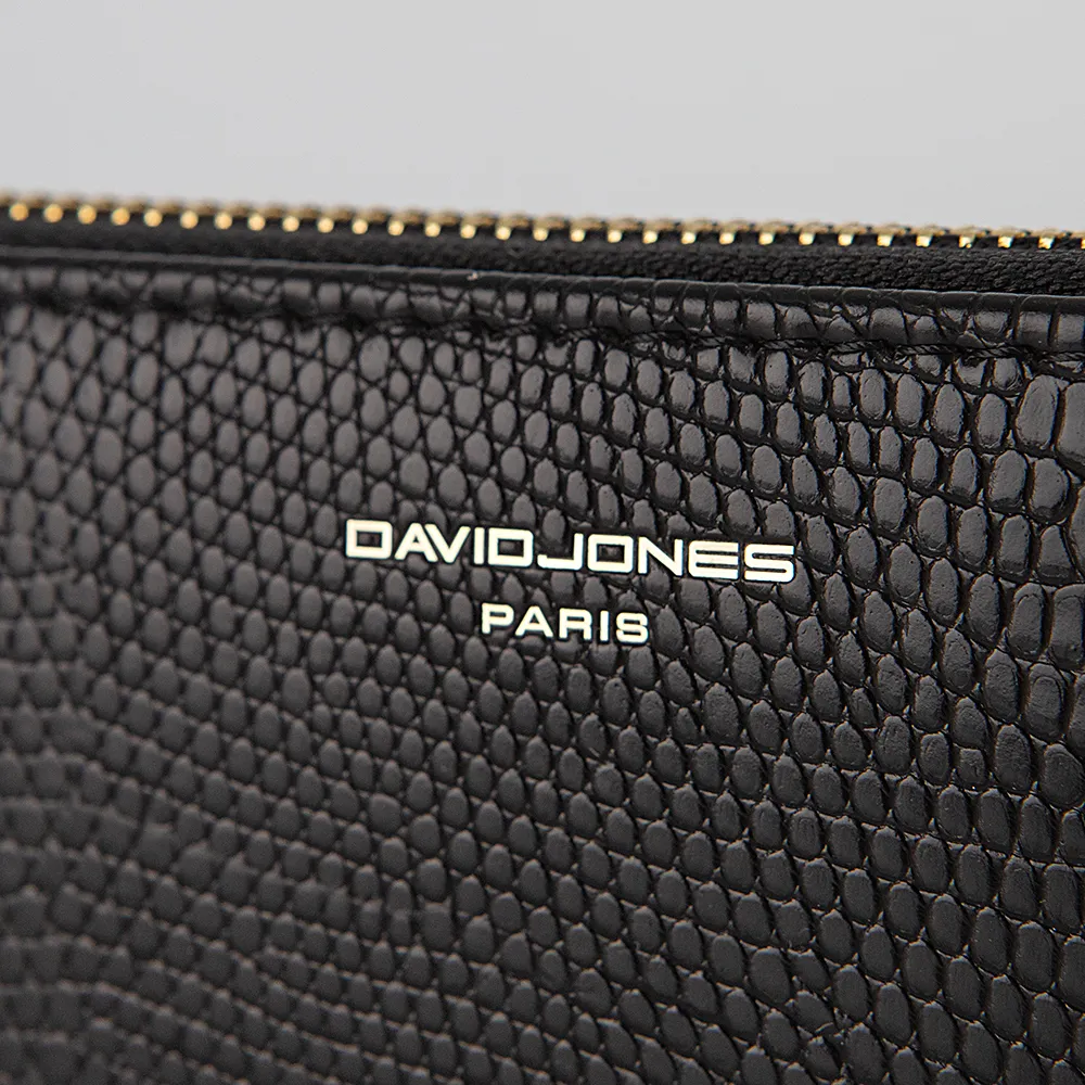 Полноразмерный кошелек от торговой марки David Jones из искусственной кожи черного цвета. Декорирована тиснением под рептилию. Модель с отделением на молнии. Внутри: карманы для карт, купюр, карман для монет на молнии.