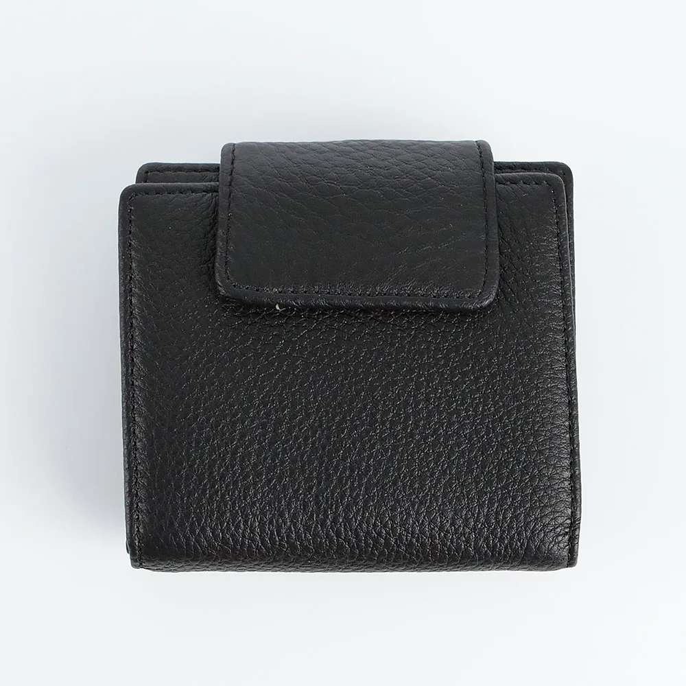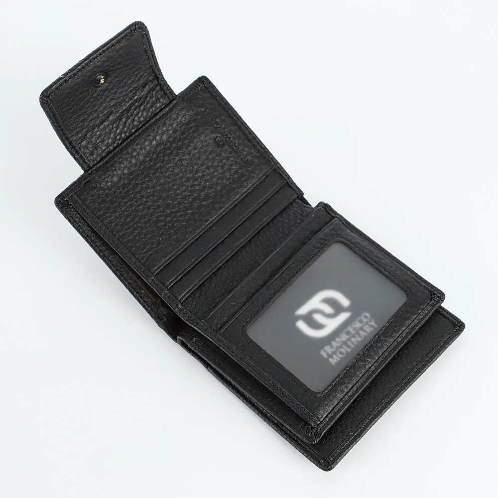 Кошелек от торговой марки Francesco Molinary из натуральной кожи черного цвета. Модель закрывается клапаном на кнопке; имеет одно сложение, раскрывается книжкой. Внутри: отделение для купюр, карманы для карт, откидная перегородка с карманом-окошком. Снаружи на задней стороне – карман на молнии.