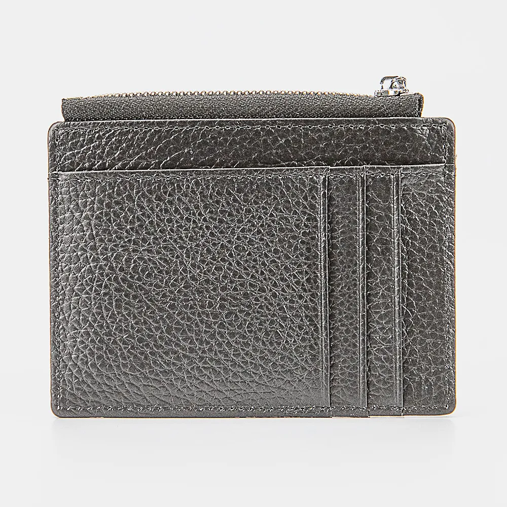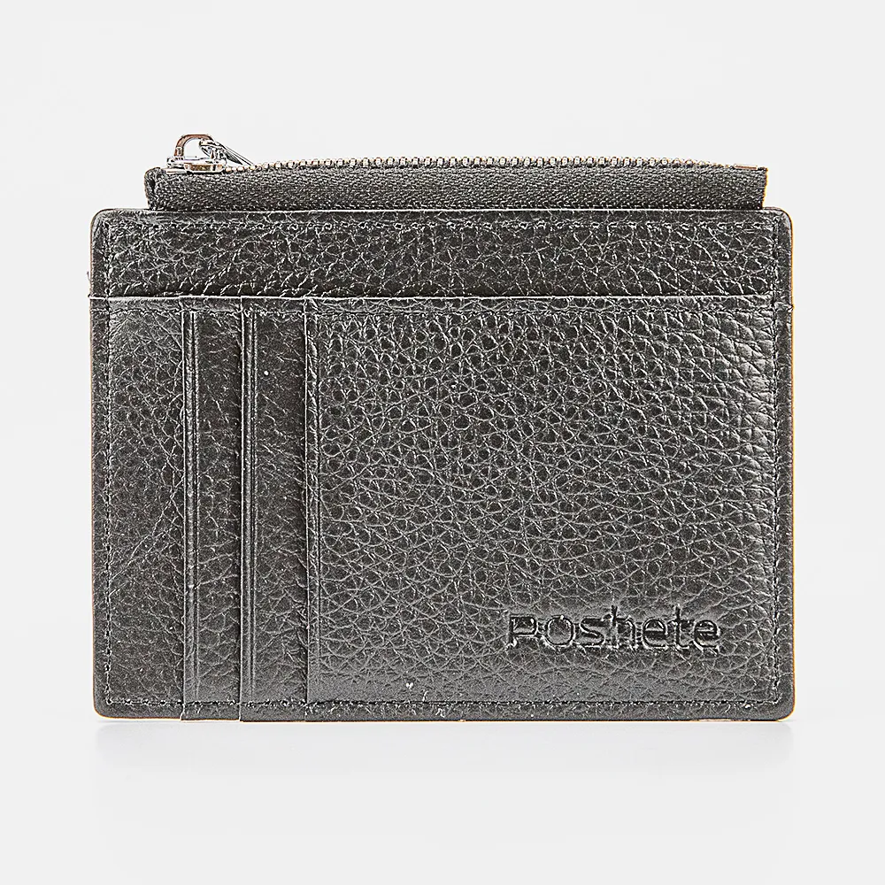 Кредитница от торговой марки Poshete из натуральной кожи черного цвета. Плоская практичная модель с карманами для карт по обеим сторонам и отделением на молнии.