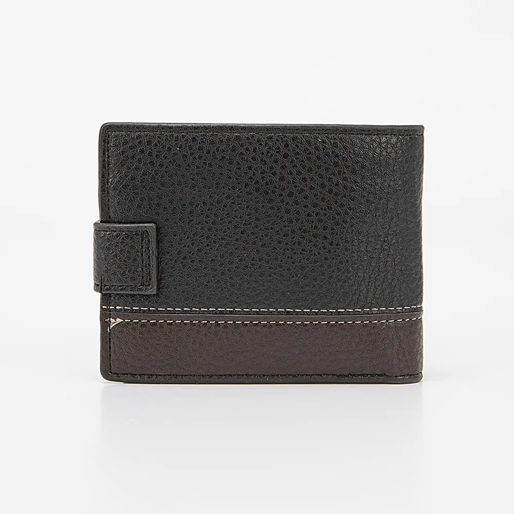 Кошелек от торговой марки Passo Avanti из искусственной кожи в сочетании коричневого и черного цвета с контрастной отстрочкой. Закрывается хлястиком на кнопку, имеет одно сложение. Отделение для купюр, карман на молнии, карманы для карт, перегородка с карманами для карт и карманом-окошком, карман для монет с клапаном на кнопке.