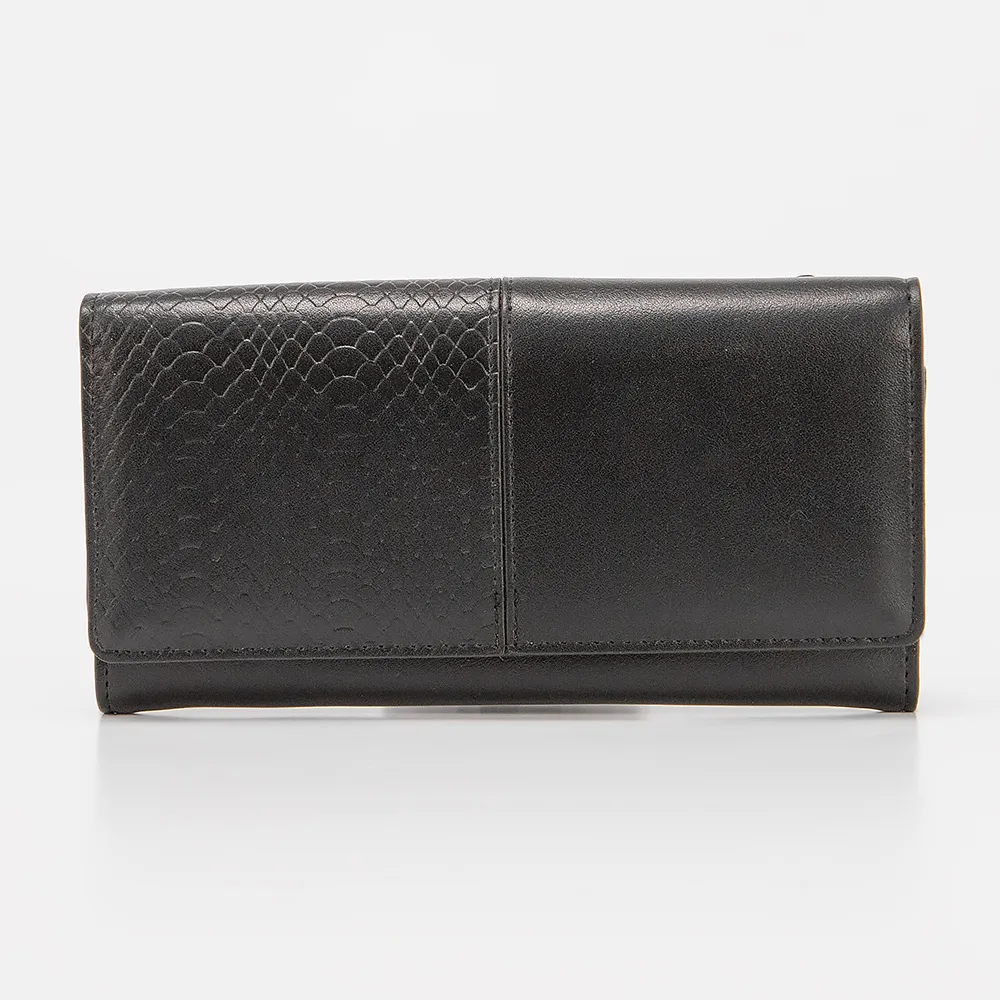 Полноразмерный кошелек от торговой марки Passo Avanti из искусственной кожи черного цвета. Модель с клапаном на скрытых магнитах. Внутри: отделения для купюр, карманы для карт, карман для монет на молнии. Снаружи на задней стороне – карман на молнии. Лицевая сторона декорирована вставкой с тиснением под змеиную кожу.