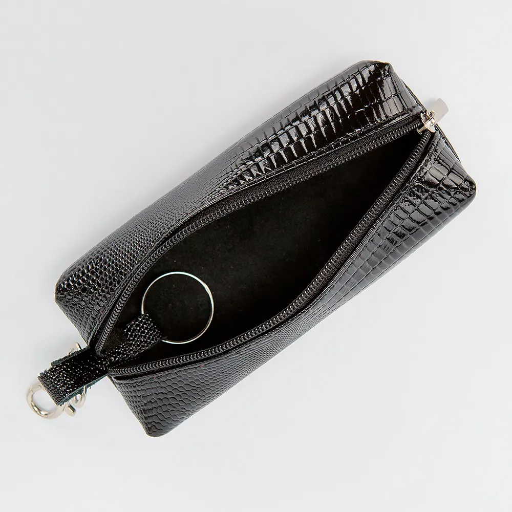 Ключница от торговой марки Poshete из натуральной кожи с тиснением под рептилию. Модель с карабином для крепления. Отделение на молнии, без подкладки. Внутри: кольцо для ключей.