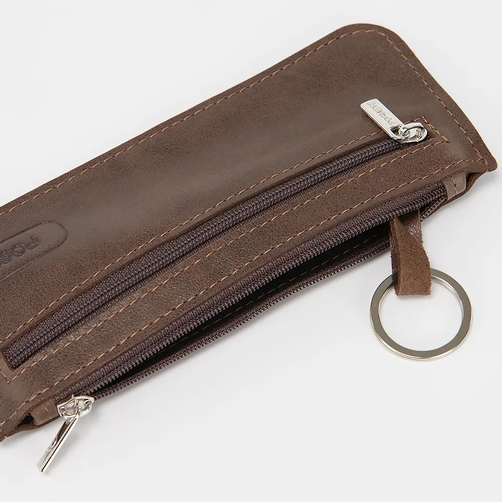 Ключница от торговой марки Poshete выполнена из натуральной кожи коричневого цвета. Отделение на молнии. Внутри: кольцо для крепления. Снаружи имеется карман на молнии.
