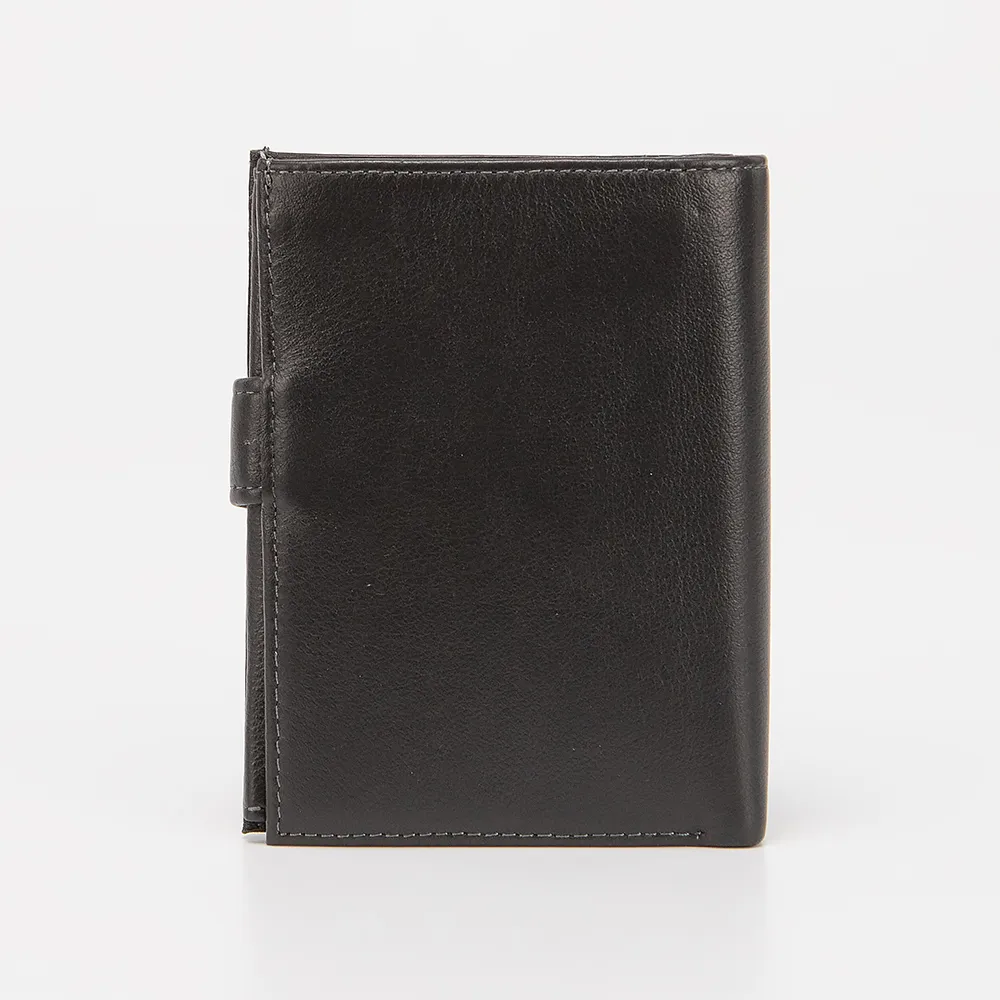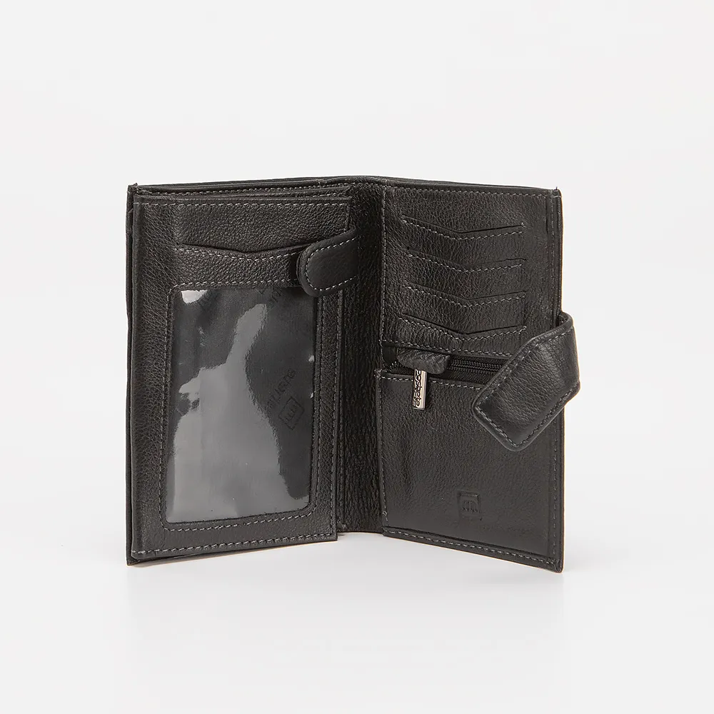 Стильный и практичный мужской кошелек Poshete из натуральной кожи черного цвета. Внутри отделение для купюр, карман для монет на молнии и несколько прорезей для пластиковых карт, карман-окошко. Модель с застежкой на кнопку. Раскрывается книжкой.