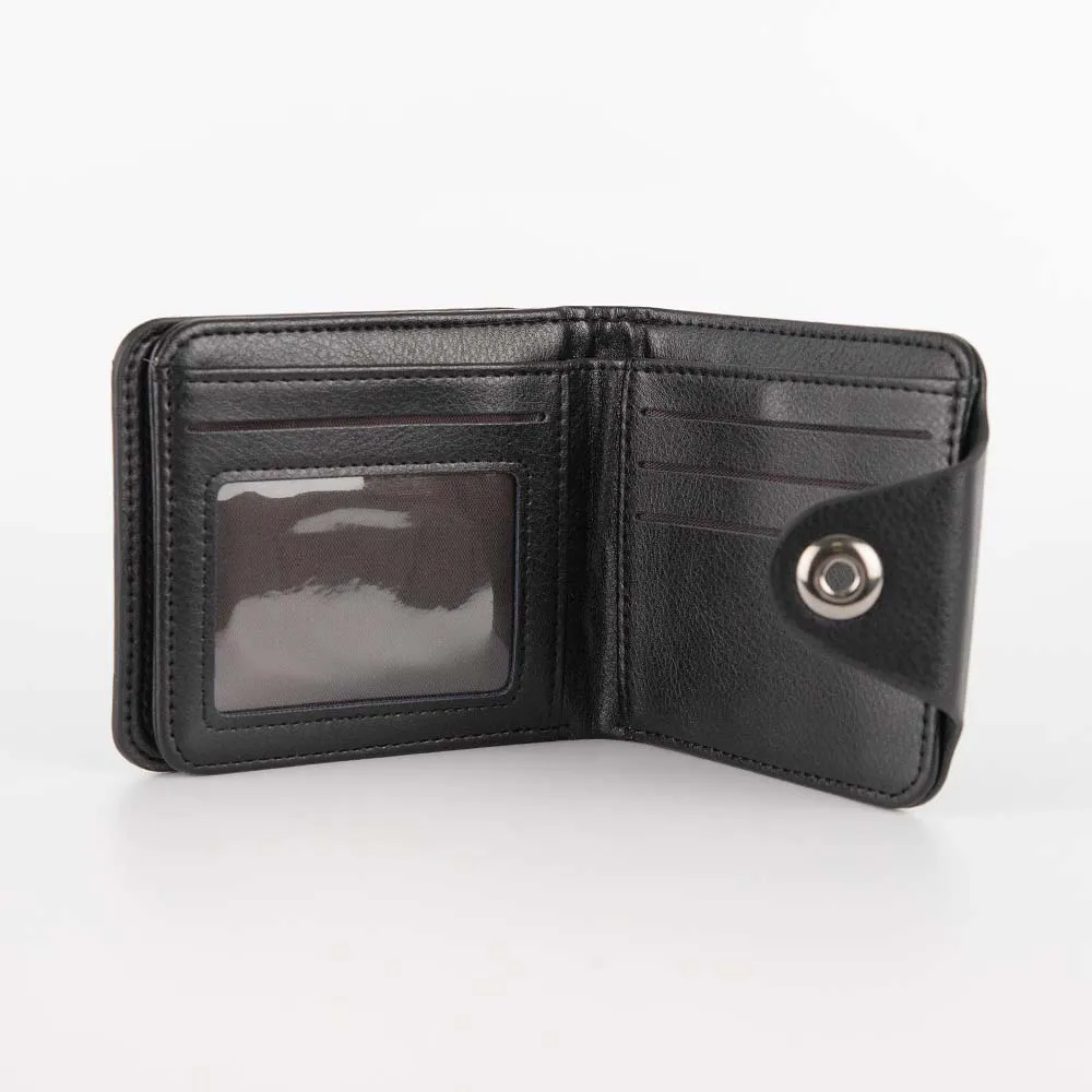 Компактный мужской кошелёк от бренда Passo Avanti выполнен из мягкой искусственной кожи. Модель чёрного цвета, складывается пополам и закрывается на магнит, внутри одно отделение для купюр, карман на молнии для монет, шесть кармашков для карточек, прозрачный кармашек и кармашек для симки. Кошелёк удобно раскладывается в ладони, купюры не придётся складывать.