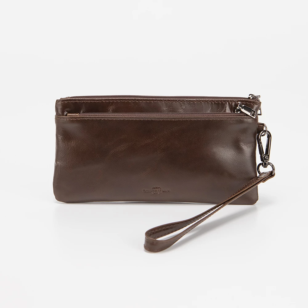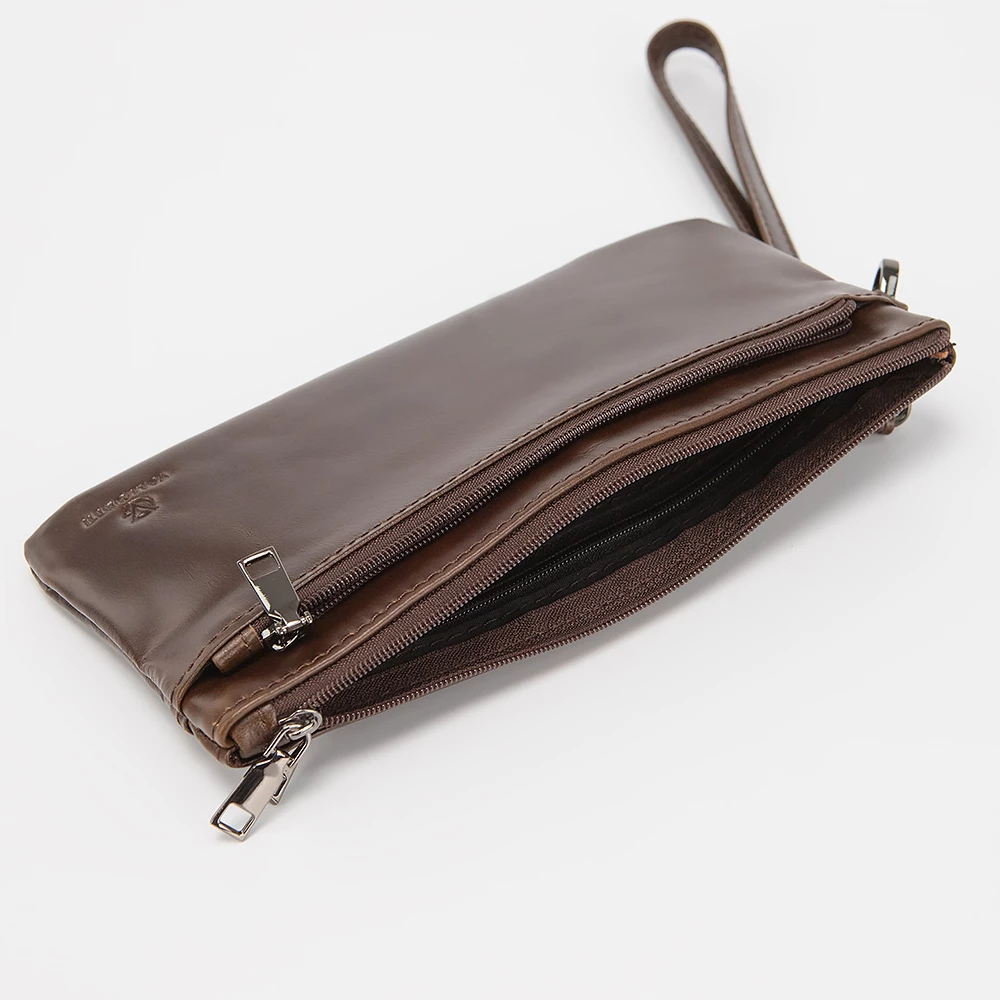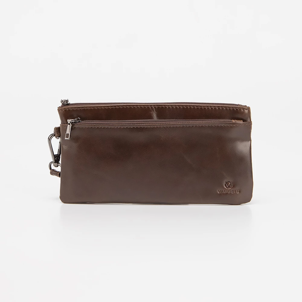 Полноразмерный кошелек от бренда Valigetti из натуральной кожи коричневого цвета. Отделение на молнии. В отделении на молнии имеется карман на молнии. С лицевой и задней стороны — карман на молнии. Имеется съемный ремешок на запястье.