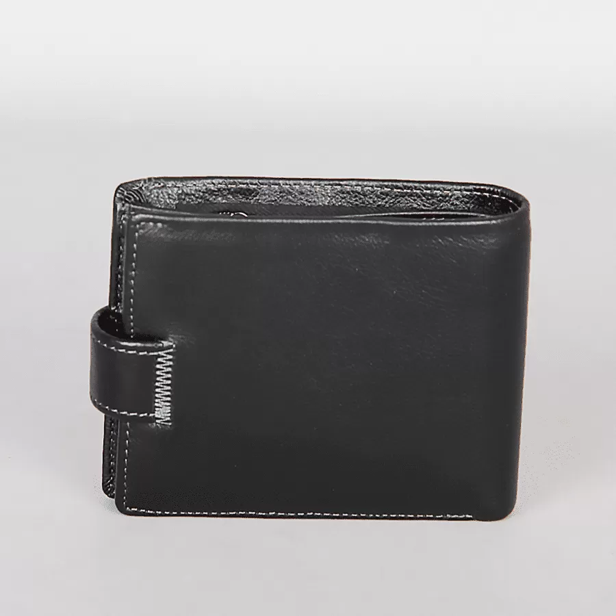 Классический кожаный кошелёк бренда Poshete выполнен в чёрном цвете. Он компактен и удобен в использовании. Модель складывается пополам и закрывается ремешком на кнопку.