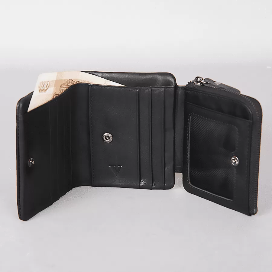 Стильный кошелек бренда Valigetti, выполненный из натуральной кожи, представлен в черном цвете. Спереди расположен карман с металлической молнией, который придает ему особый шарм. Этот кошелек не только красив, но и очень удобен в использовании. Он складывается втрое, и внутри есть десять отделений для пластиковых карт. Также есть отдельный карман с сеткой и карманом на молнии, а также отделение для купюр. Кошелек застегивается на кнопки, что обеспечивает дополнительную безопасность для ваших ценных вещей.