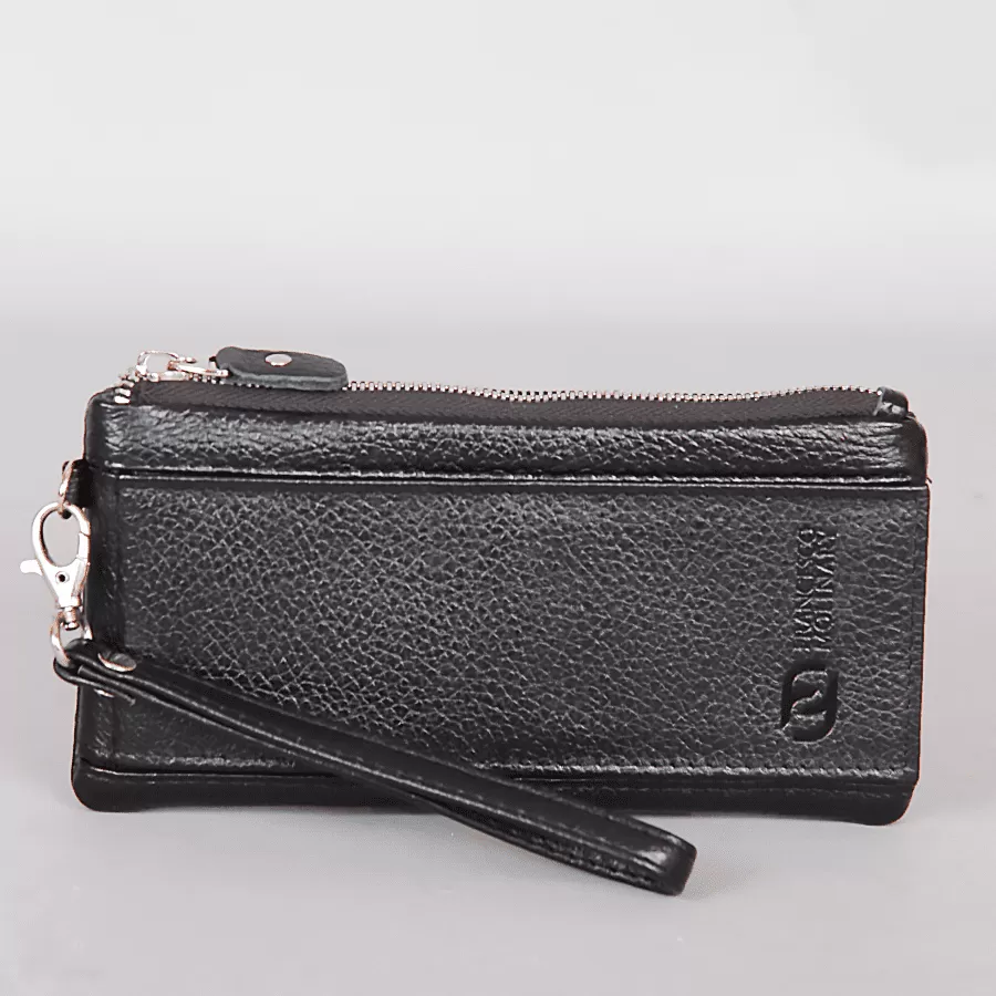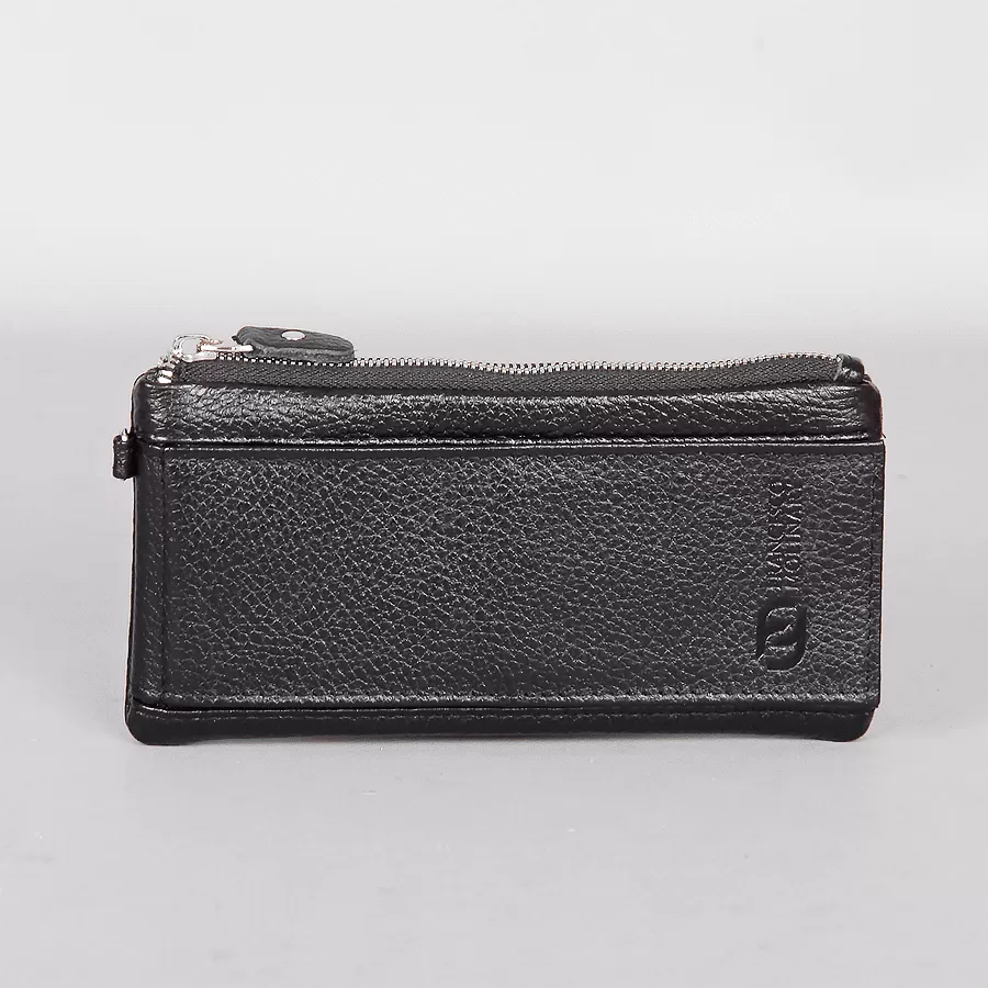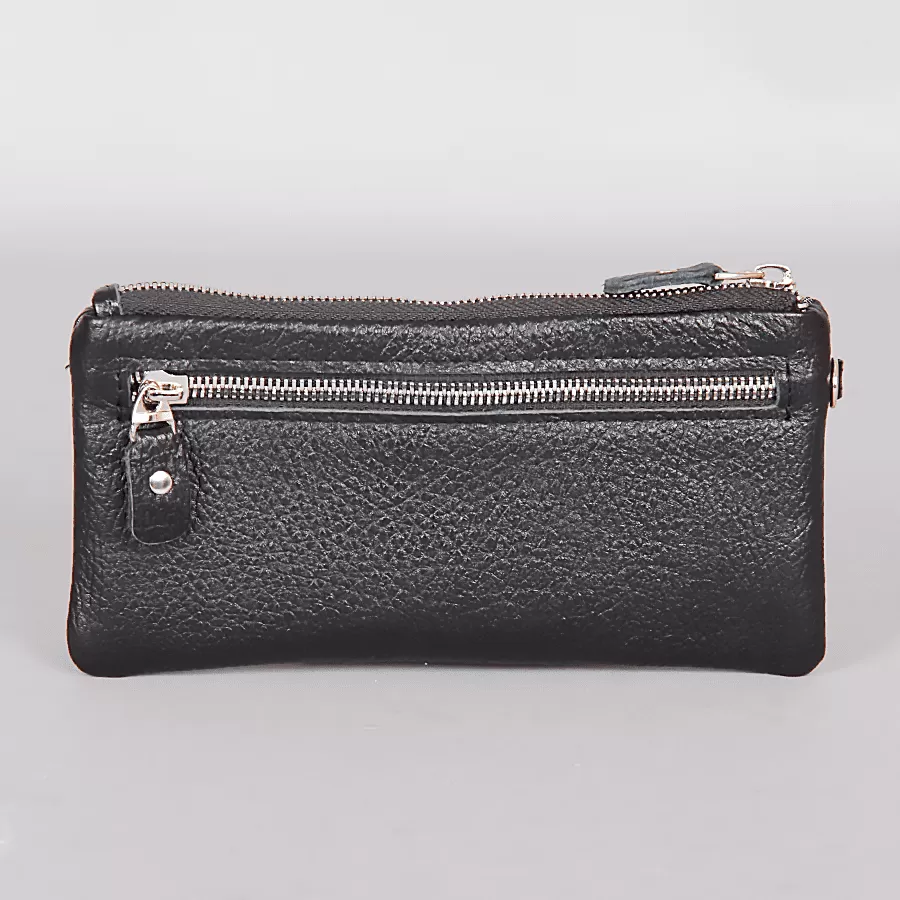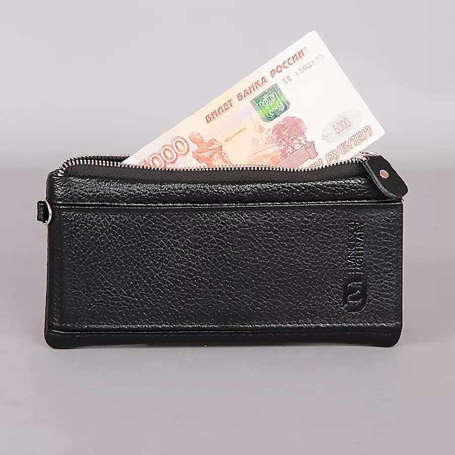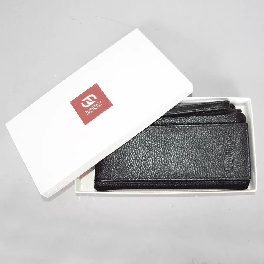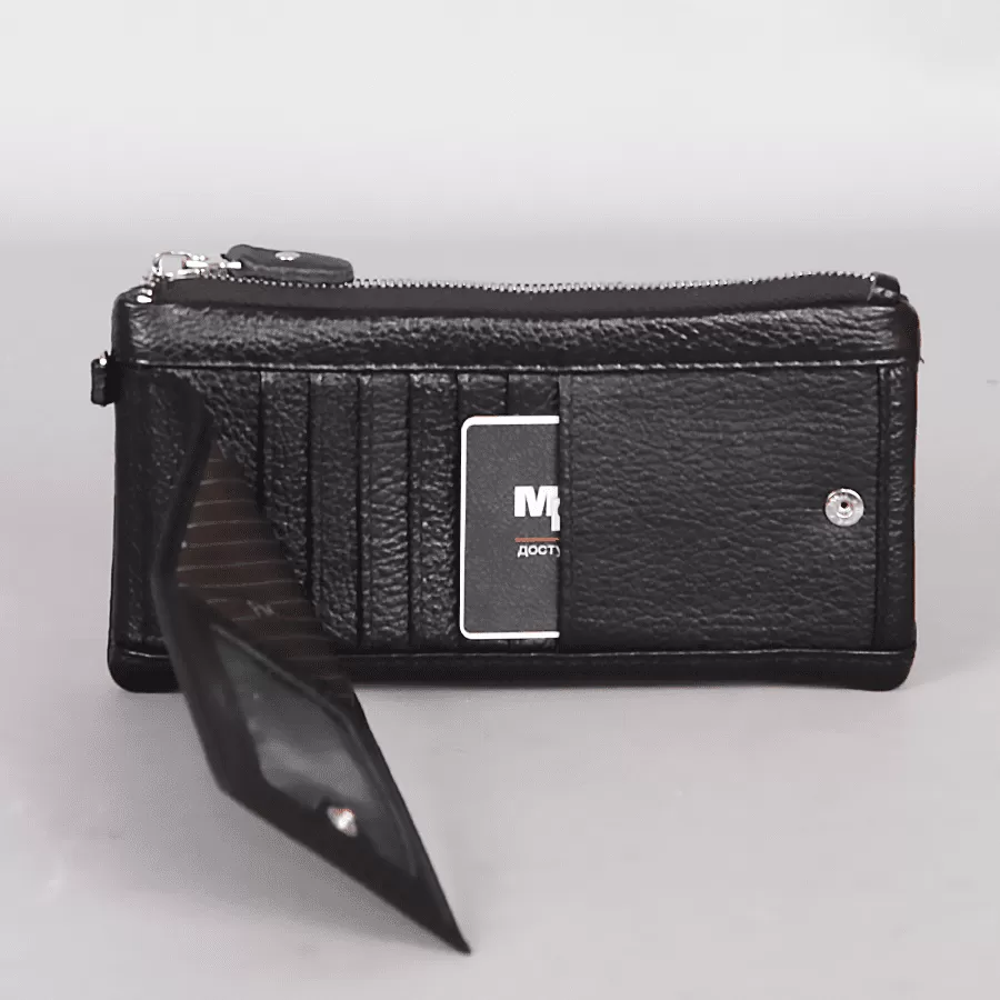 Кошелек бренда Francesco Molinary изготовлен из натуральной кожи черного цвета и имеет ремешок на запястье. Снаружи кошелька расположен карман на молнии с одной стороны и откидная перегородка на кнопке с другой стороны. Под перегородкой находятся карманы для пластиковых карт, а на самой перегородке есть карман-окошко. Основное отделение кошелька закрывается на молнию и украшено стильной серебристой фурнитурой. Внутри основного отделения есть фирменная подкладка и разделение на два отдела.