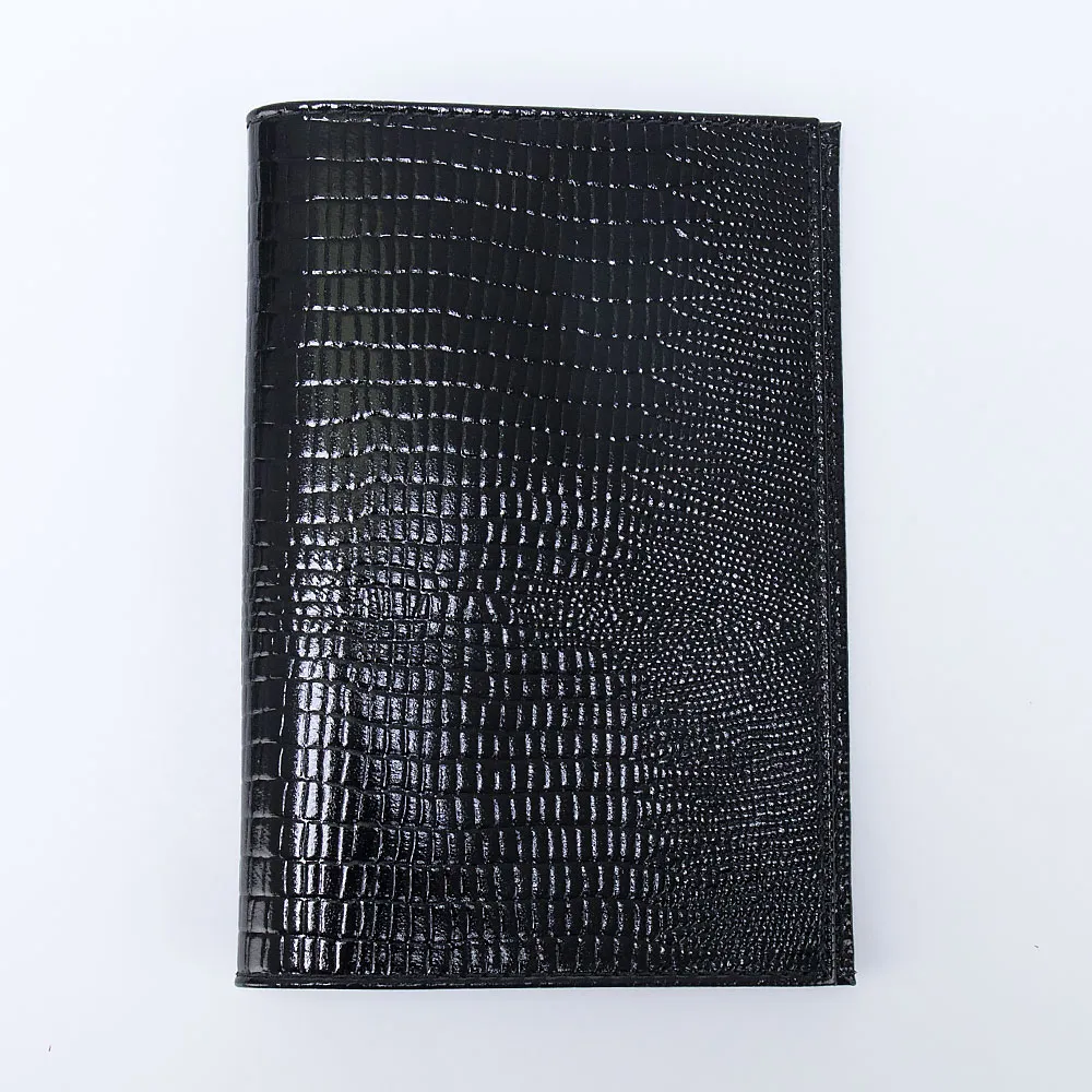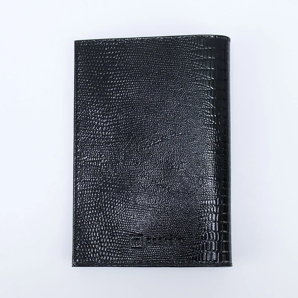 Обложка для паспорта от бренда Poshete выполнена в черном цвете из натуральной мягкой кожи и дополнена тиснением под кожу каймана.