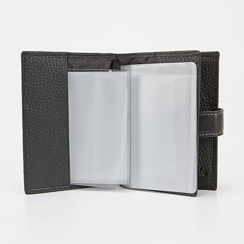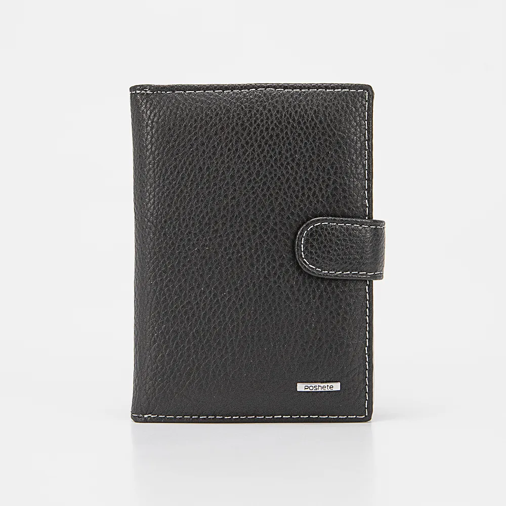 Универсальная обложка для паспорта и автодокументов от торговой марки Poshete изготовлена из натуральной кожи черного цвет с контрастной отстрочкой. Закрывается хлястиком на кнопку. Внутри: отделение-разворот для паспорта, отделения для документов, карманы для карт, блок с прозрачными файлами разного формата для автодокументов, карман-окошко.
