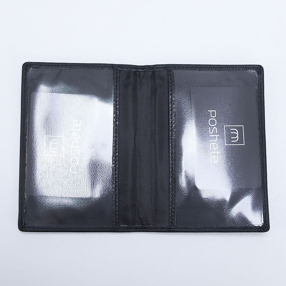Обложка для паспорта Poshete чёрного цвета из натуральной матовой кожи. Универсальная, подойдёт для мужского портфеля, дамской сумочки или дорожного саквояжа. Внутри текстиль в полоску коричневого цвета. Кармашки для фиксации первой и последней страницы паспорта прозрачные.