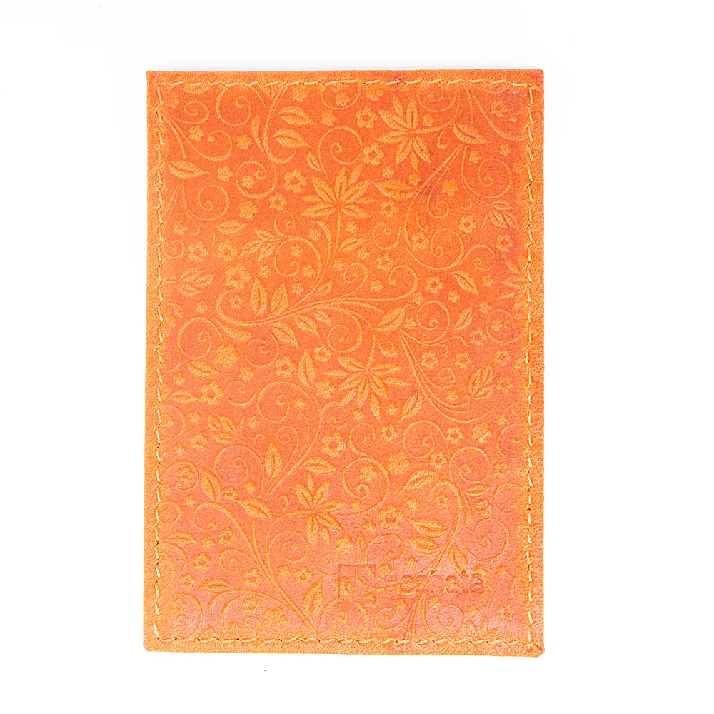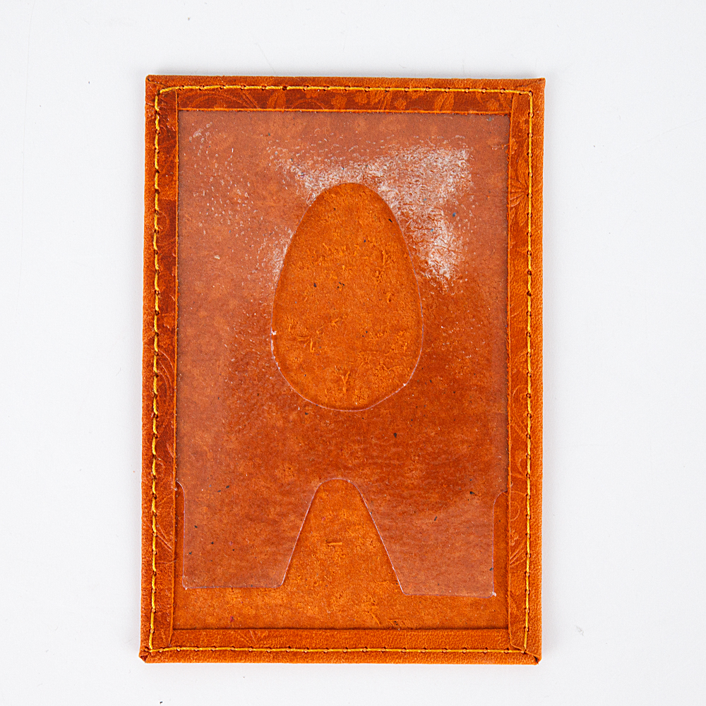 Картхолдер от торговой марки Poshete из натуральной кожи оранжевого цвета. Декорирована оригинальным цветочным тиснением. Модель с прозрачным клапаном.