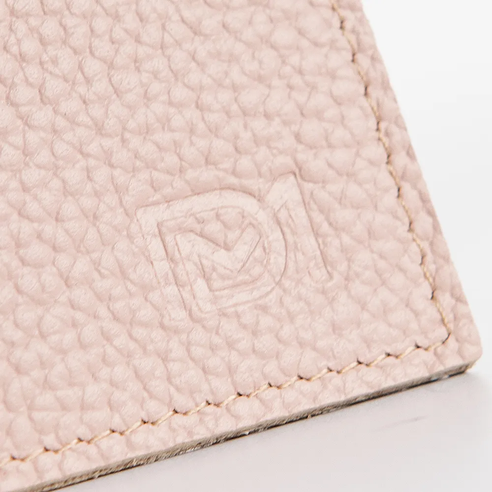 Обложка для паспорта от торговой марки Domenico Morelli из натуральной кожи пудрового цвета. Модель с хлястиком на кнопке. Внутри кожаные клапаны и 4 прорезных кармана для пластиковых карт.