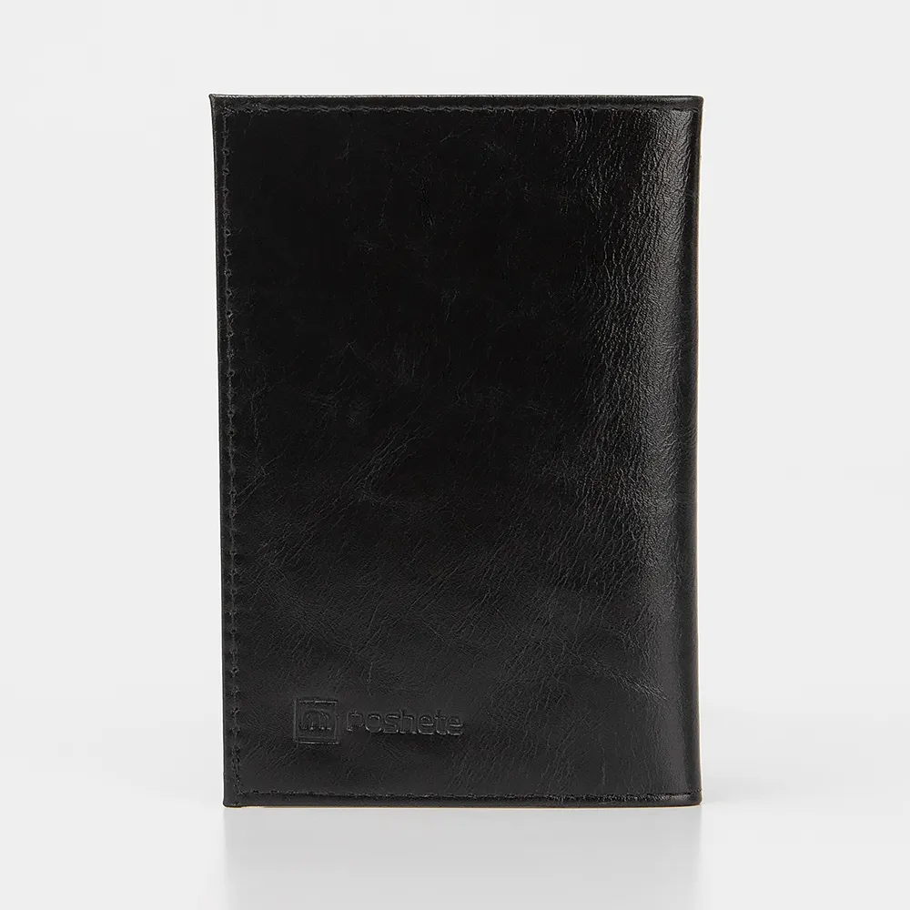 Обложка для паспорта от торговой марки Poshete выполнена из натуральной кожи черного цвета с тиснением в виде орла и надписи Паспорт. Модель раскрывается книжкой. Внутри - прозрачные клапаны.