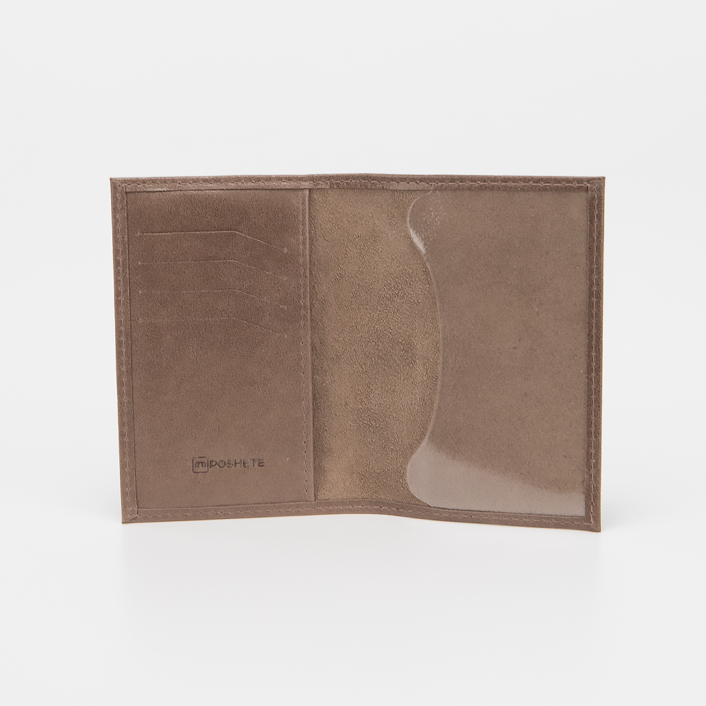Обложка для паспорта от торговой марки Poshete выполнена из натуральной кожи бежевого цвета. Лицевая сторона декорирована тиснением с гербом России и надписью: «Russia. Passport». Модель раскрывается книжкой. Внутри - карманы для карт и прозрачный клапан.