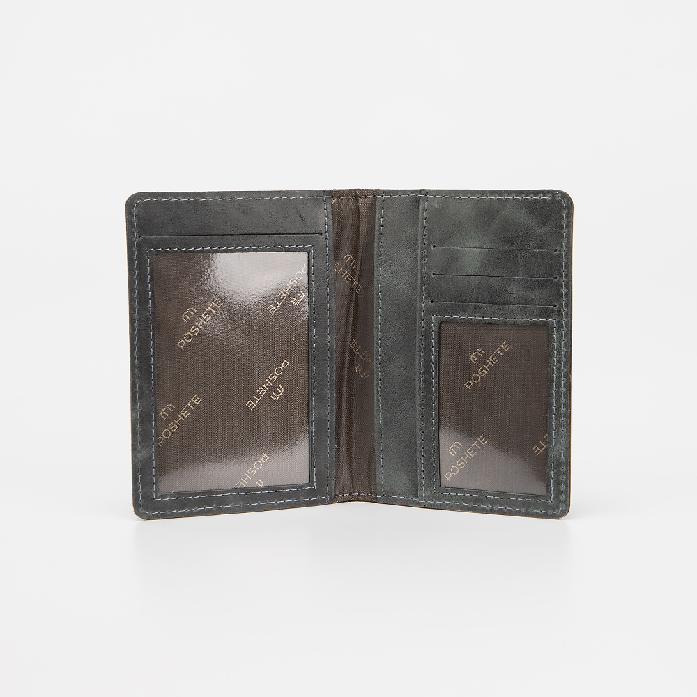 Обложка для автодокументов от торговой марки Poshete из натуральной кожи. Модель без застежки, раскрывается книжкой. Внутри: два кармана-окошка, карманы для документов и карт разного размера.