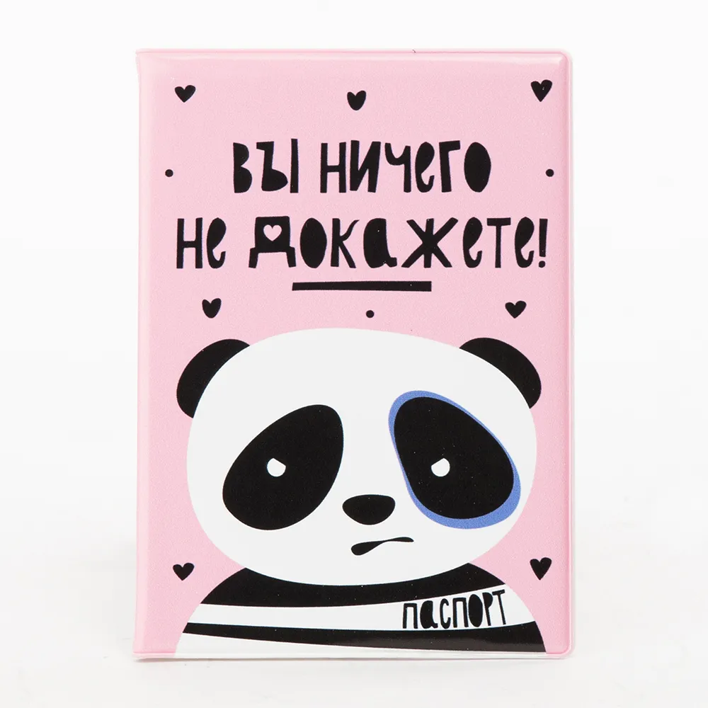Обложка для паспорта от торговой марки «Орландо» из материала ПВХ. Модель розового цвета с изображением панды и надписью «Вы ничего не докажете». Внутри: прозрачные клапаны для обложки паспорта.