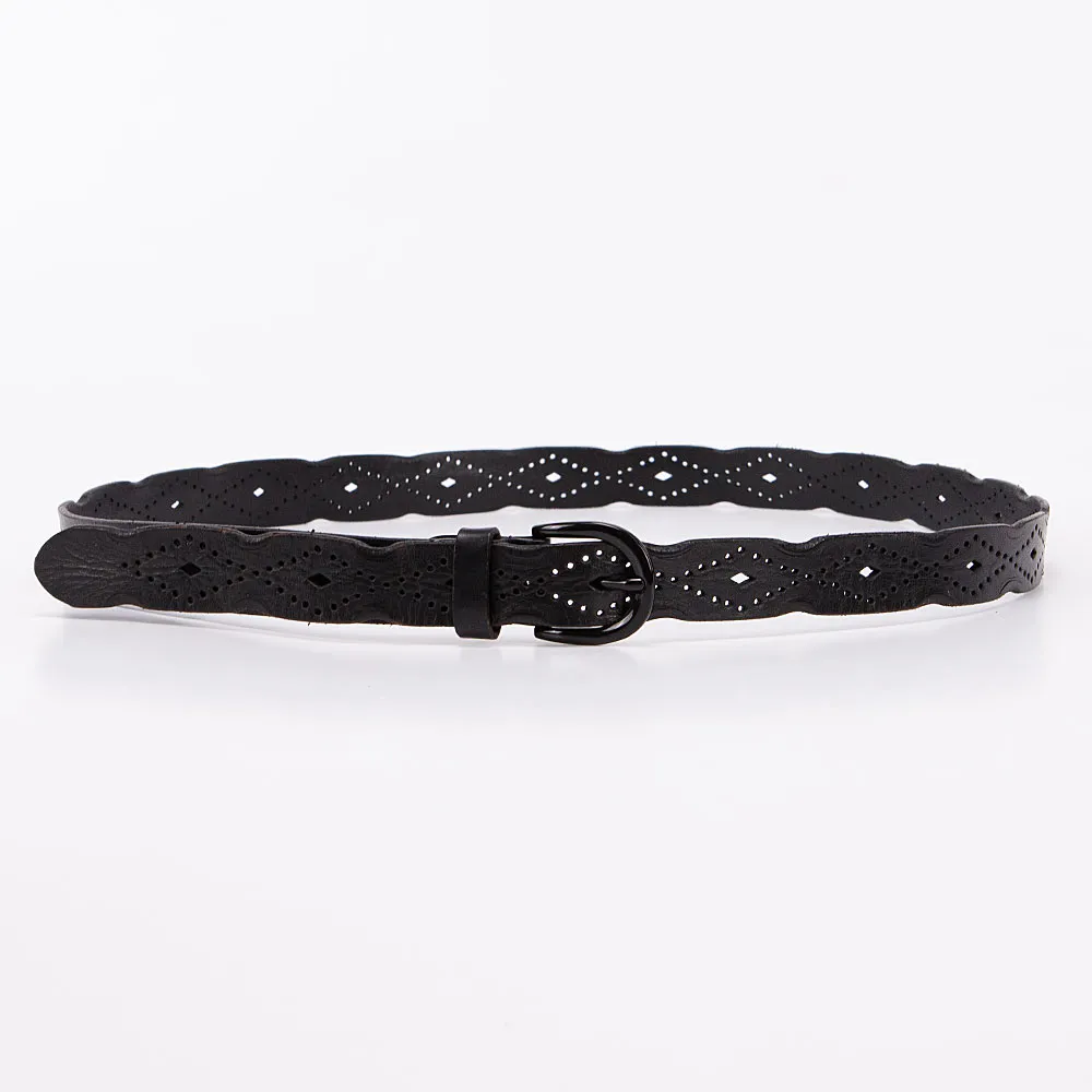 Стильный женский ремень от бренда Poshete выполнен из натуральной толстой кожи, украшен перфорацией, края волнистые. Ремень тёмно-голубого цвета, ширина 3 см, длина 95-105 см. Стальная овальная пряжка с «язычком», одна шлёвка и классические отверстия для фиксации объёма, на конце овальной формы.
