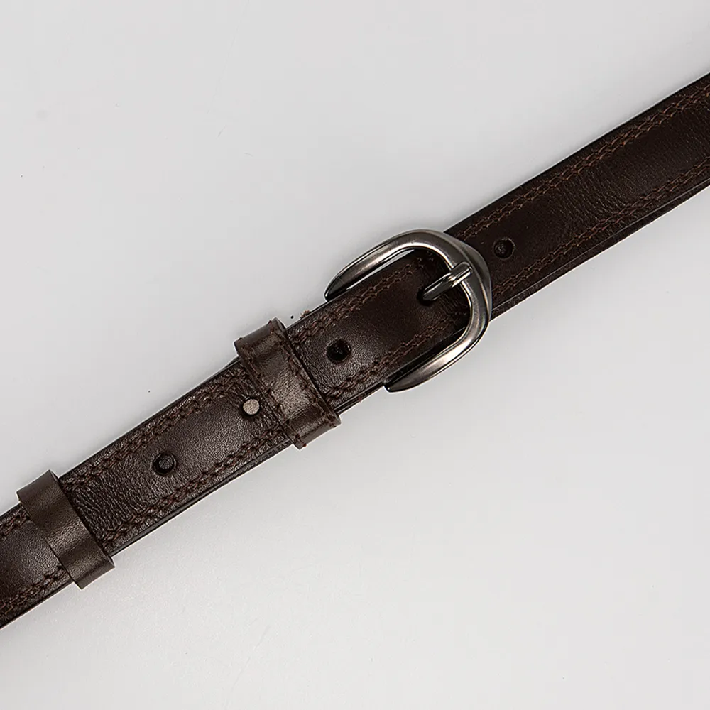 Женский ремень от торговой марки Poshete из натуральной кожи. Модель шириной 2,5 см, длиной 111-115 см. Размер: L. Металлическая пряжка, две шлевки. Декорирован и усилен двойной отстрочкой.