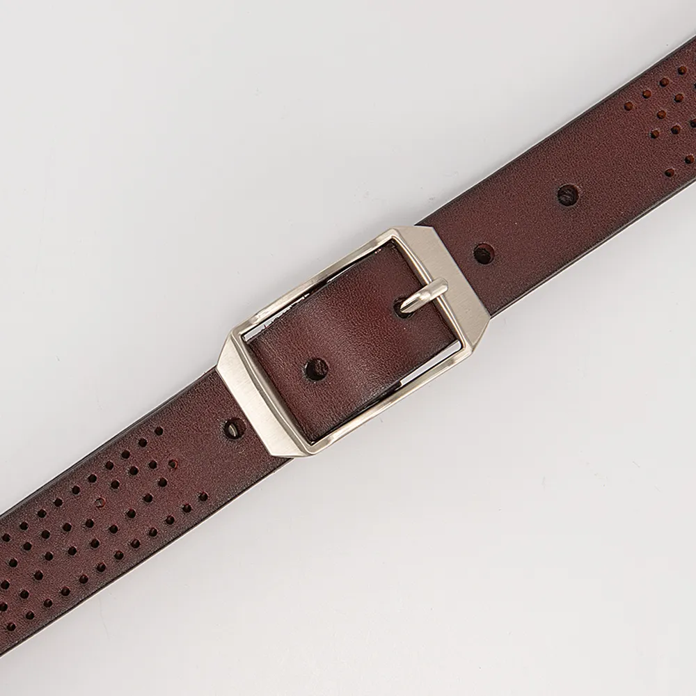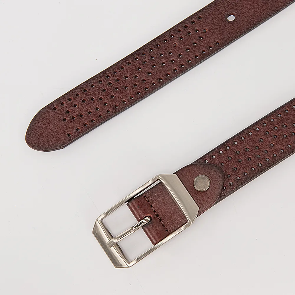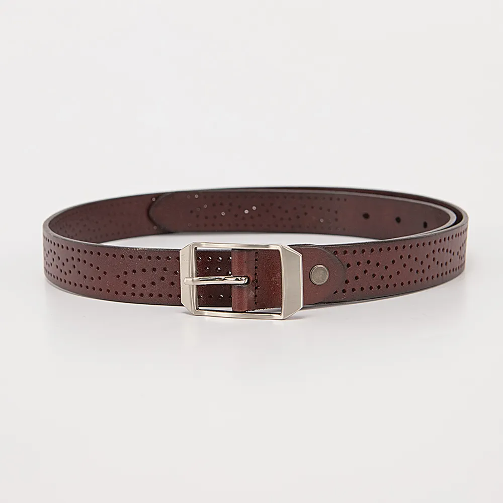 Небольшой узкий ремешок от бренда Poshete выполнен из натуральной мягкой кожи классического коричневого цвета с перфорированным узором и дополнен небольшой открытой металлической пряжкой серебристого цвета и кожаной шлевкой. Модель длиной 111-115 см и шириной 2,8 см.