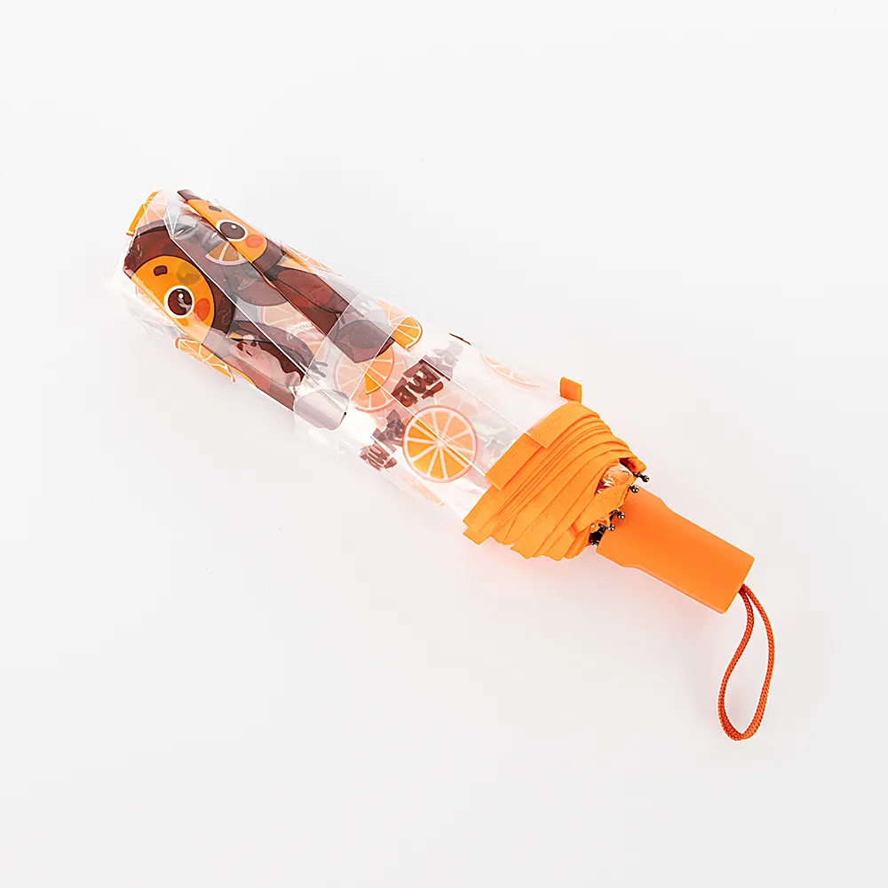 Складной механический зонт с материалом купола из ПВХ и нейлона. Прозрачный купол декорирован рисунком с Чебурашкой и апельсинами. Модель имеет 3 сложения, 8 спиц, диаметр купола – 98 см. Ручка прямая пластиковая. Длина в сложенном виде – 24,5 см.