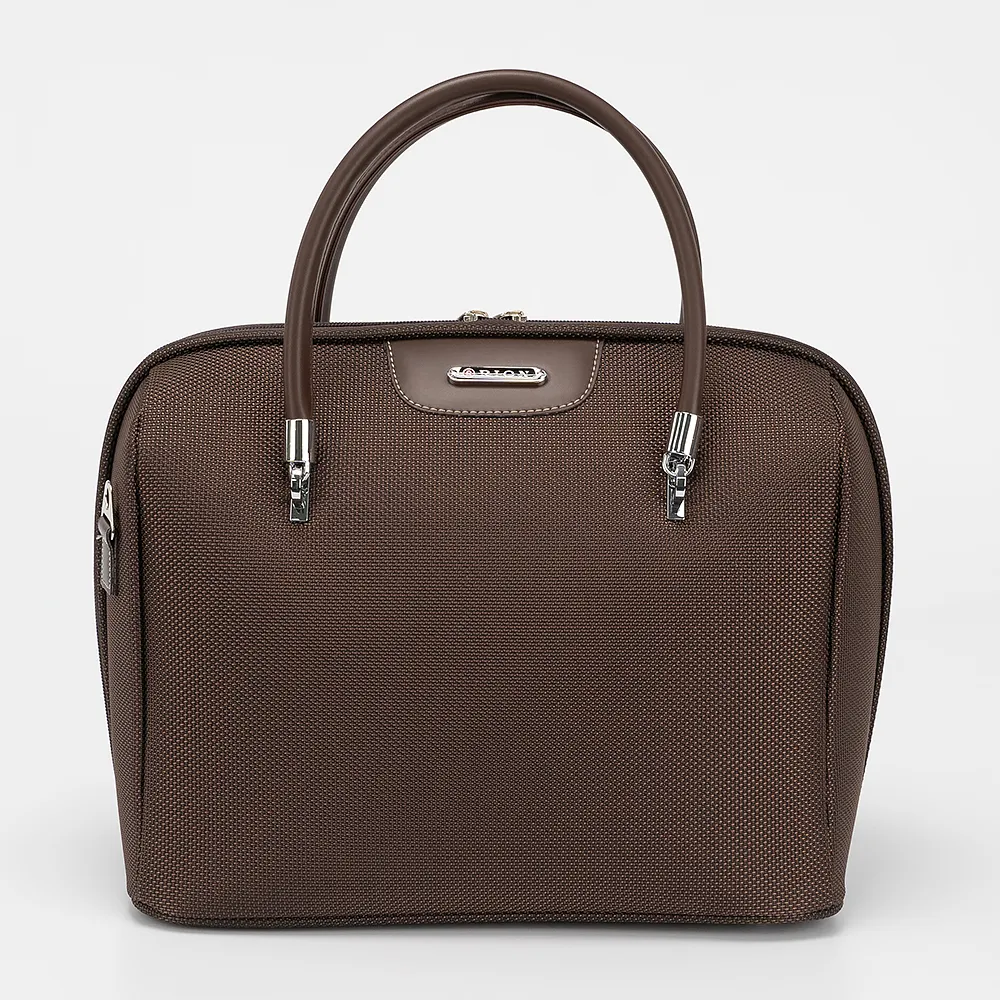 Бьюти-кейс от торговой марки Rion из текстильного материала коричневого цвета с принтом в клетку. Модель с двумя удлиненными ручками и лямкой для крепления на выдвижную ручку чемодана. Закрывается молнией по трем сторонам со встречными бегунками.