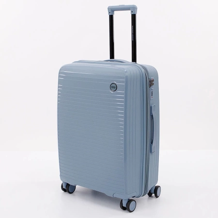 Чемодан среднего размера от бренда Francesco Molinary выполнен из прочного термостойкого полипропилена с рельефными полосами голубого цвета. Эта модель оснащена четырьмя сдвоенными пластиковыми колесами, выдвижной телескопической ручкой, прорезиненными ручками сверху и сбоку, а также пластиковыми ножками-опорами для устойчивости.