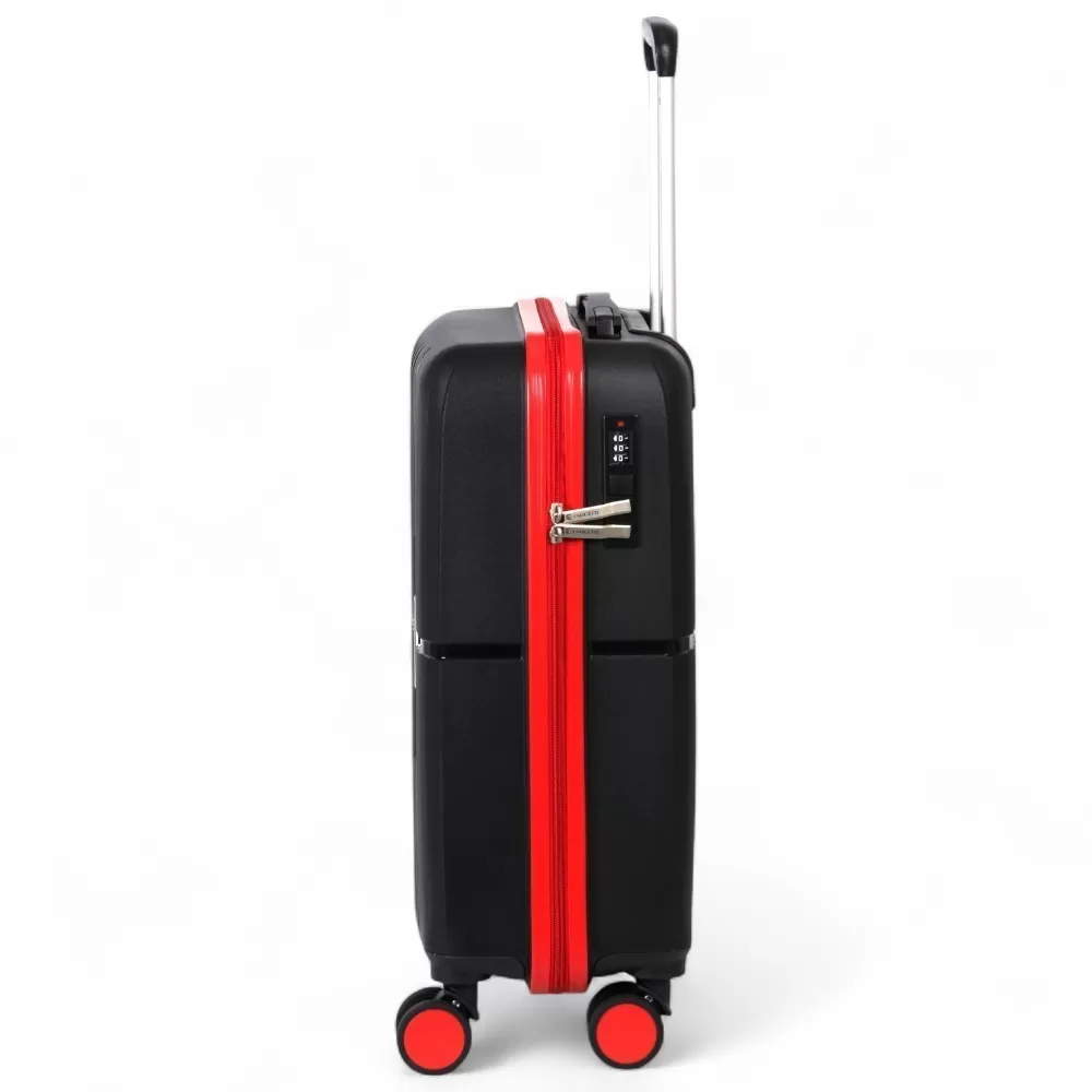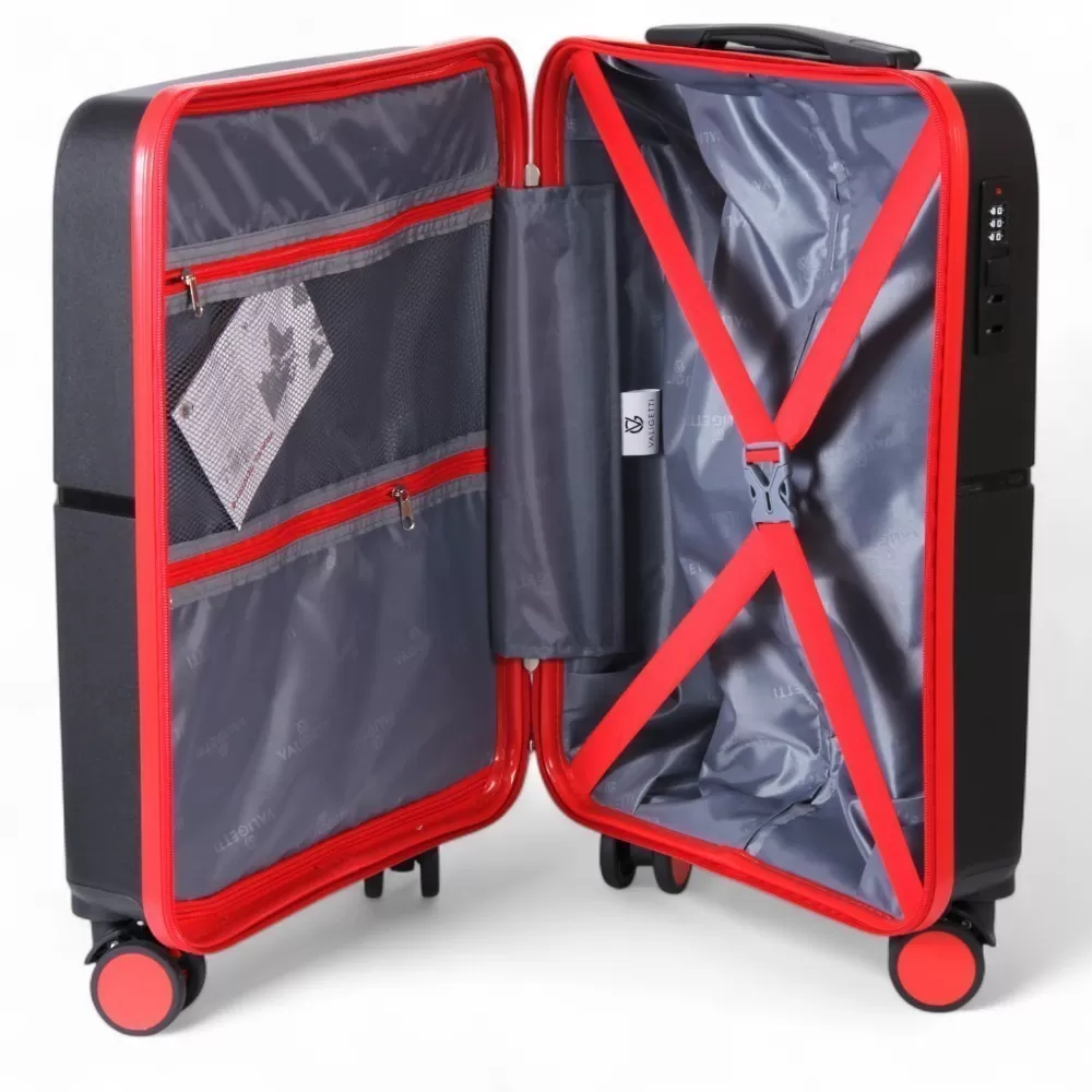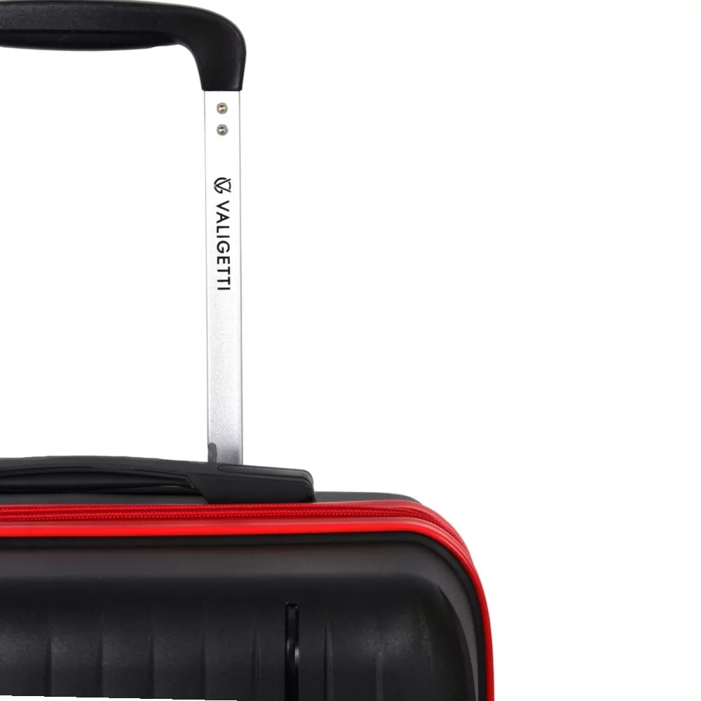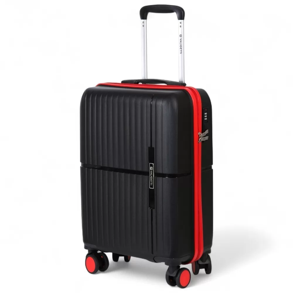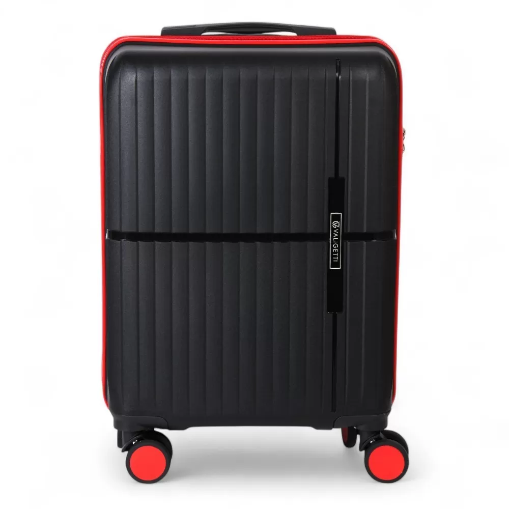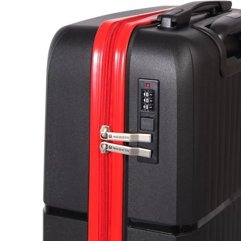 Маневренный чемодан-спиннер Valigetti создан из ударопрочного полипропилена в стильном черно-красном дизайне. У модели четыре сдвоенных пластиковых колеса и выдвижная телескопическая ручка. Есть кодовый замок. Основное отделение закрывается на молнию с двумя встречными бегунками, оснащенными ушками для навесного замка (в комплект не входит). Внутри чемодана — фирменная подкладка. В одном отделении предусмотрен разделитель на молнии и карман-сетка, в другом — перекрестные ремни для надежной фиксации багажа.