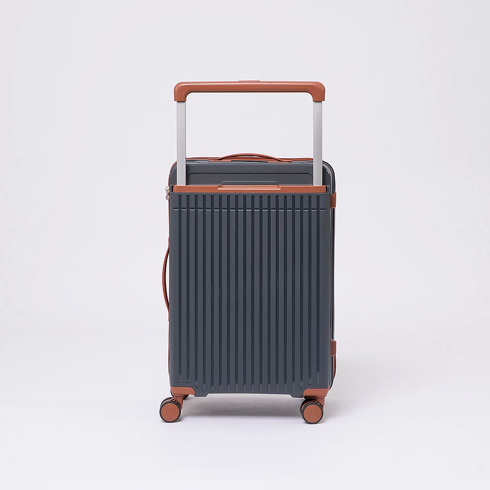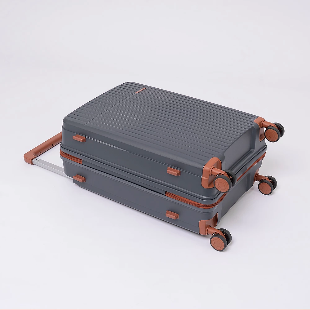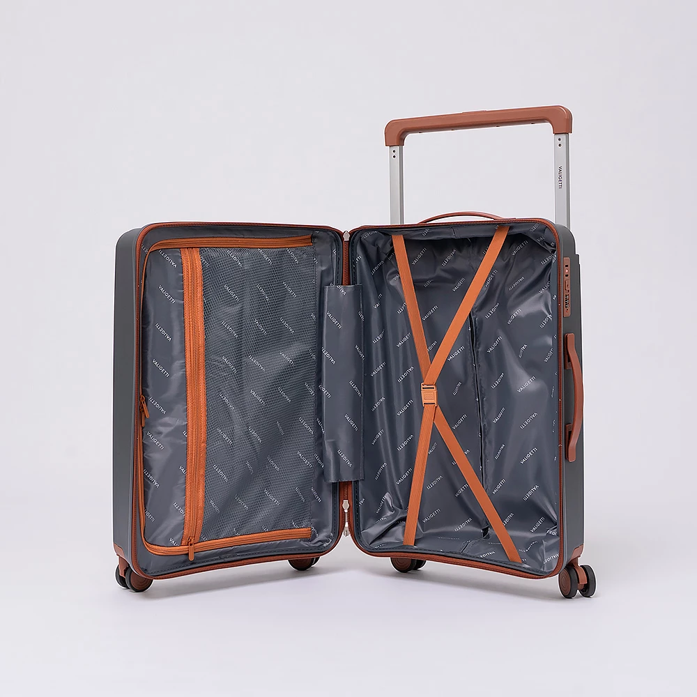 Чемодан-спиннер от бренда Valigetti выполнен из ударопрочного термостойкого полипропилена с антивандальной рельефной поверхностью серого цвета с коричневыми элементами. Модель на четырех сдвоенных пластиковых колесах, с широкой телескопической ручкой, ручкой-переноской сверху и сбоку, пластиковыми ножками для защиты от износа. Закрывается молнией №8 «антивор», имеется кодовый замок, утопленный в корпус. Внутри: фирменная подкладка, в одной части перекрестные ремни для фиксации багажа, в другой — клапан-разделитель на молнии, карман-сетка на молнии. Верхние ножки выполнены в виде крючков для подвешивания.