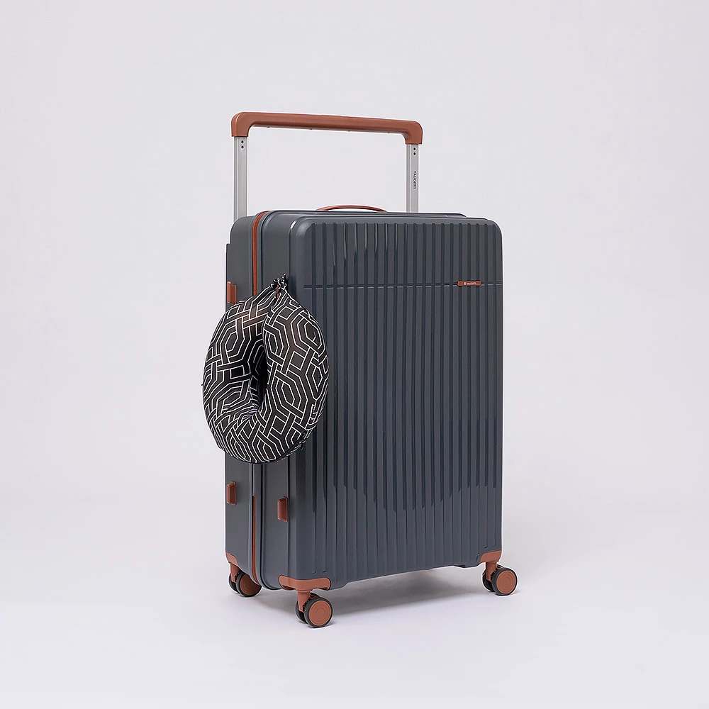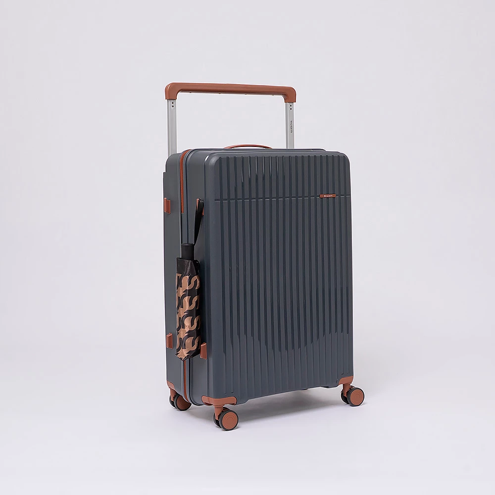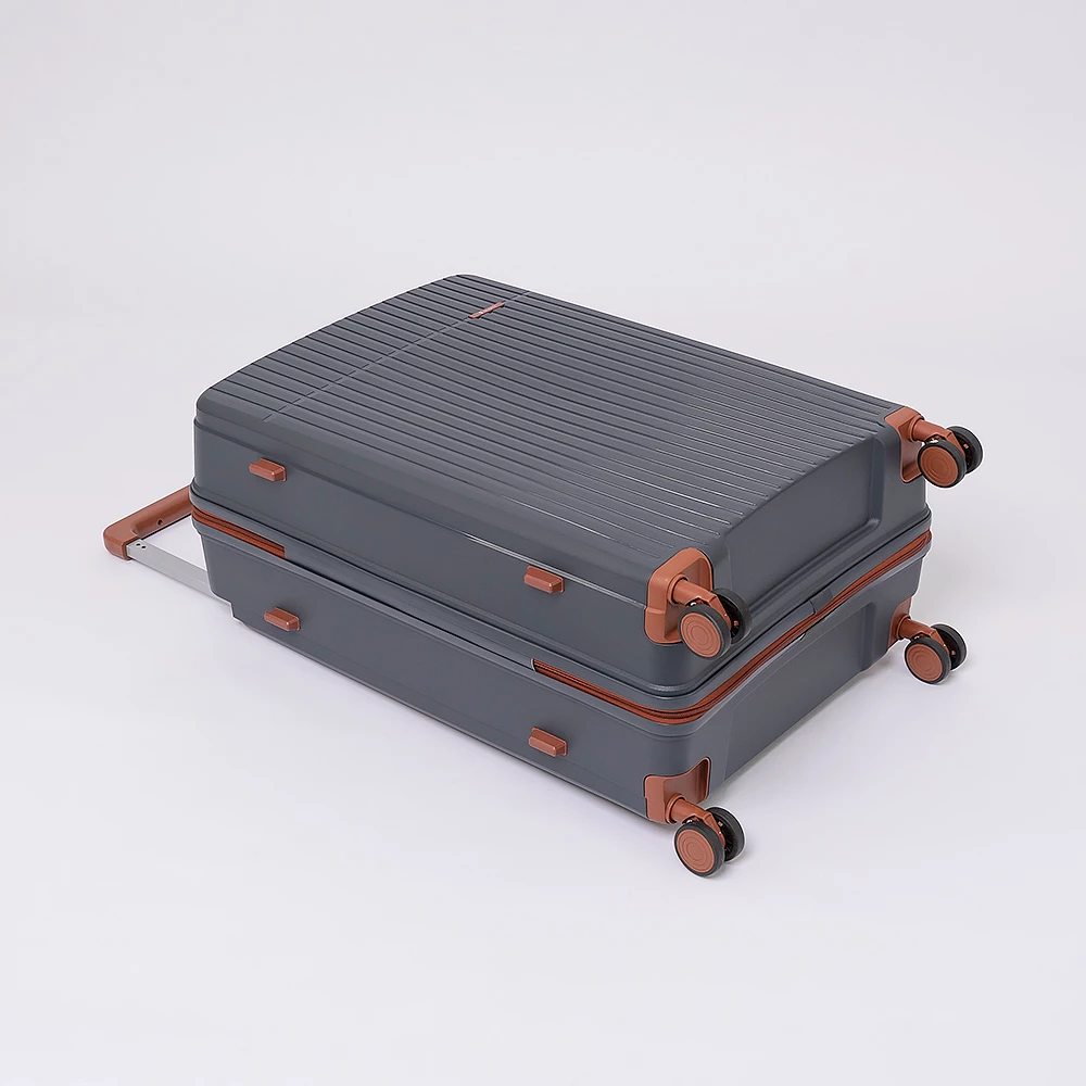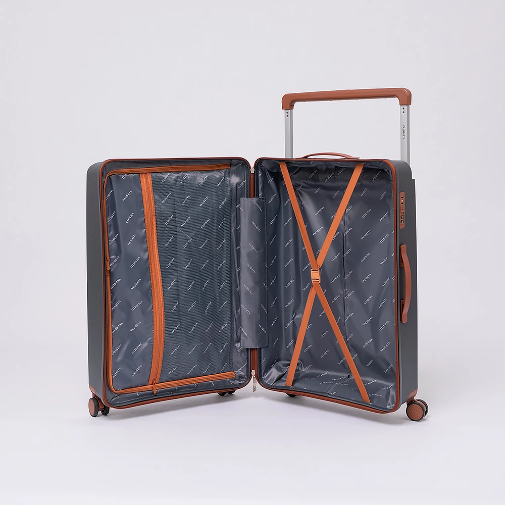 Чемодан-спиннер от бренда Valigetti выполнен из ударопрочного термостойкого полипропилена с антивандальной рельефной поверхностью серого цвета с коричневыми элементами. Модель на четырех сдвоенных пластиковых колесах, с широкой телескопической ручкой, ручкой-переноской сверху и сбоку, пластиковыми ножками для защиты от износа. Закрывается молнией №8 «антивор», имеется кодовый замок, утопленный в корпус. Внутри: фирменная подкладка, в одной части перекрестные ремни для фиксации багажа, в другой — клапан-разделитель на молнии, карман-сетка на молнии. Верхние ножки выполнены в виде крючков для подвешивания.